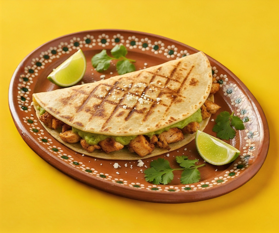 tortolla de harina bistec y chorizo acompañada de sus salsas y verdura