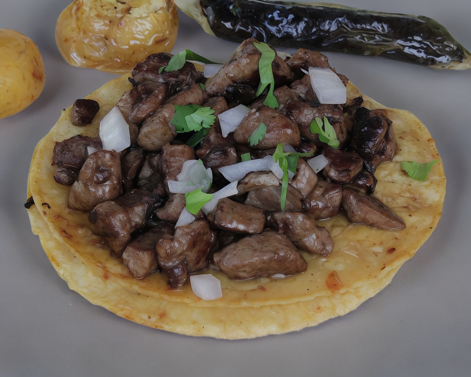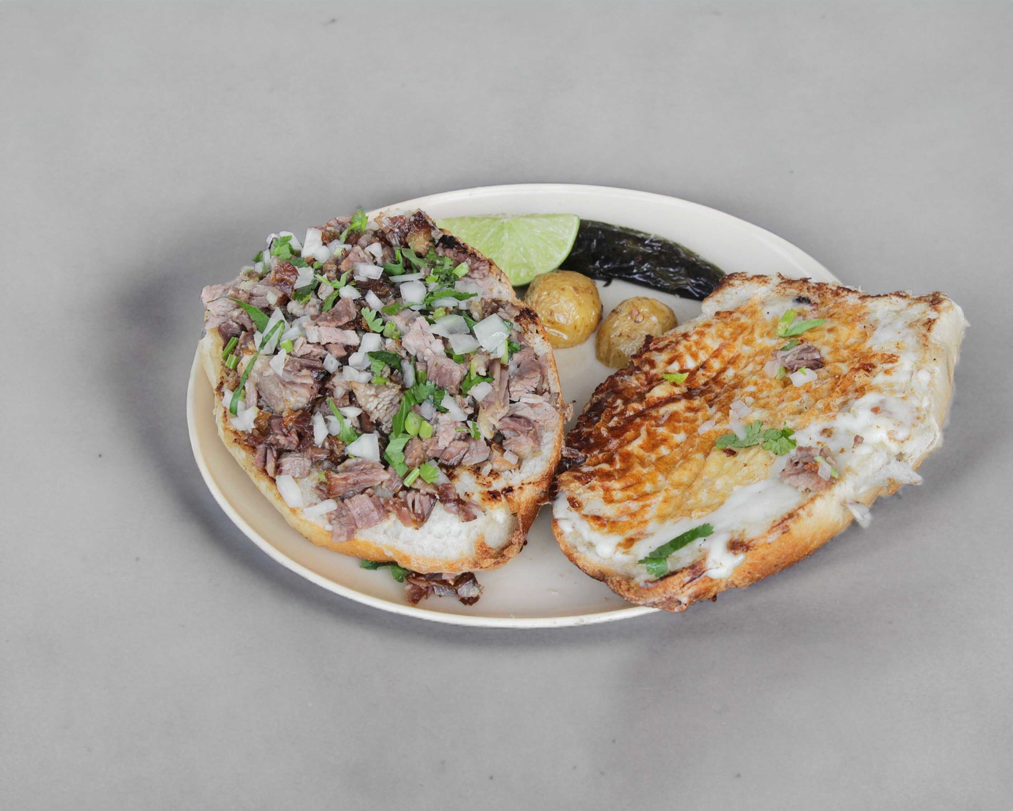Deliciosa 1 tostada con queso fundido y la carne 40Gr Aprox de tu preferencia.