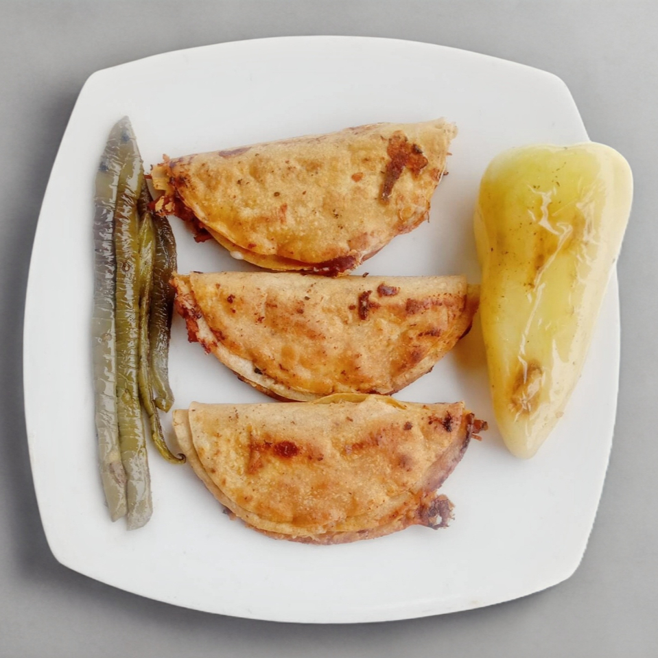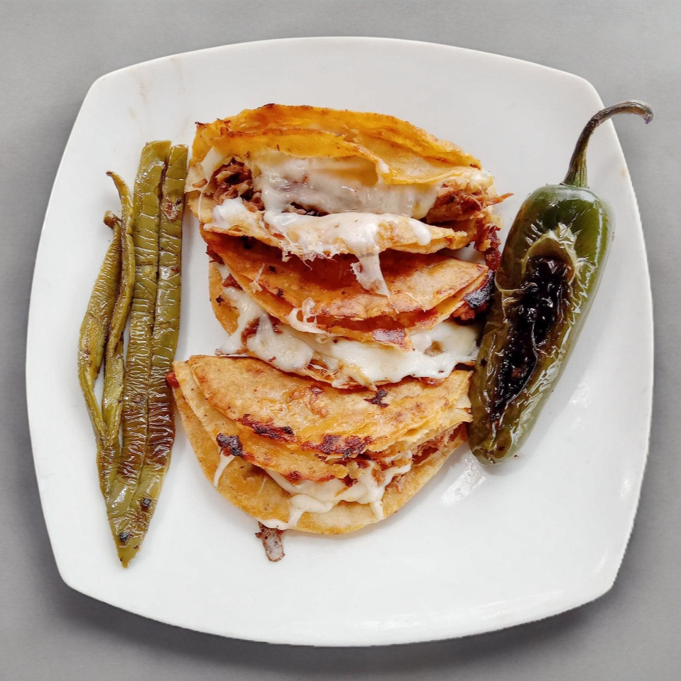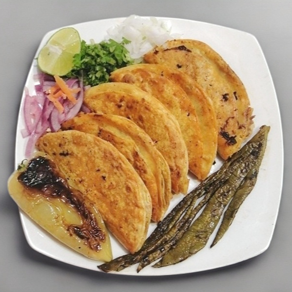 una exquisita torta de barbacoa con queso y su respectivas salsas y su verdura.