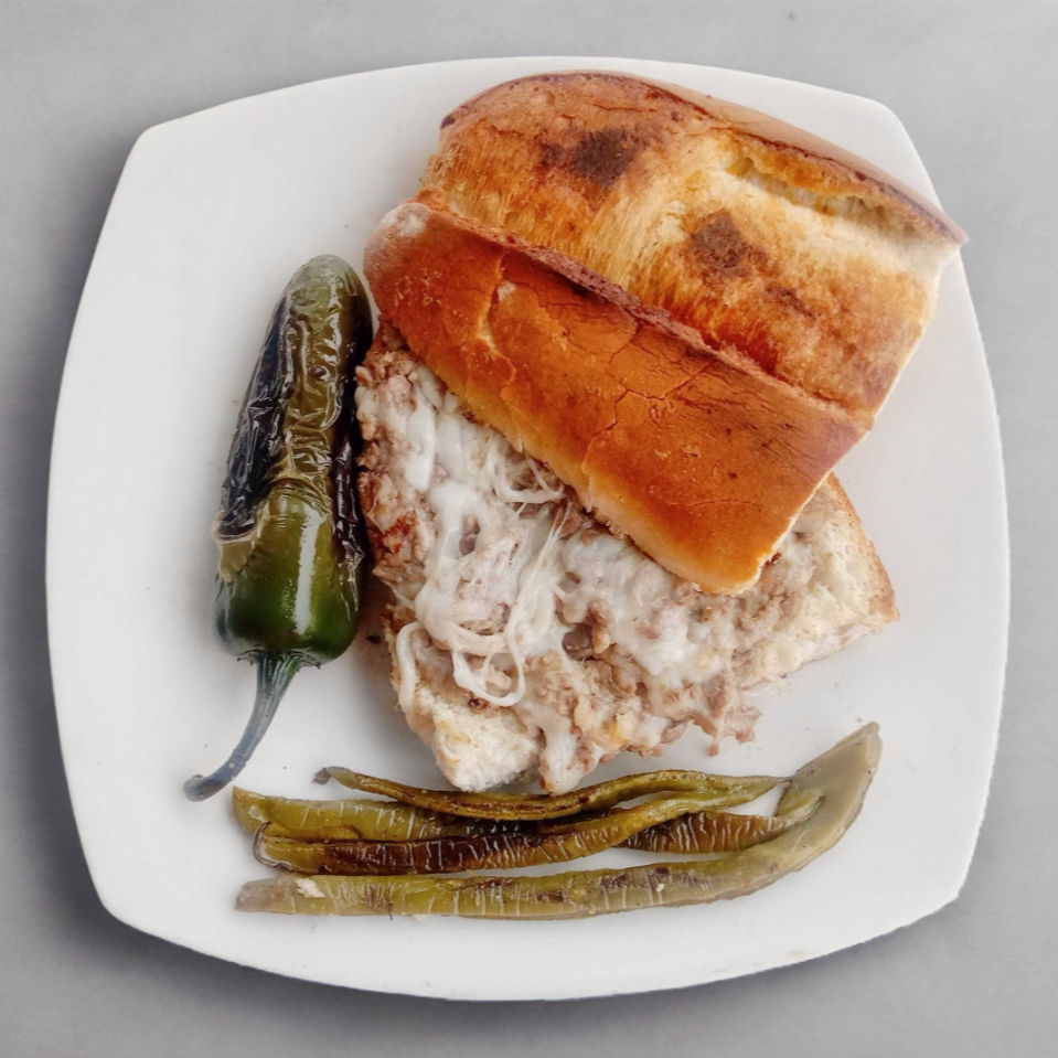una exquisita torta de bistec con queso y sus respectivas salsas y su verdura.