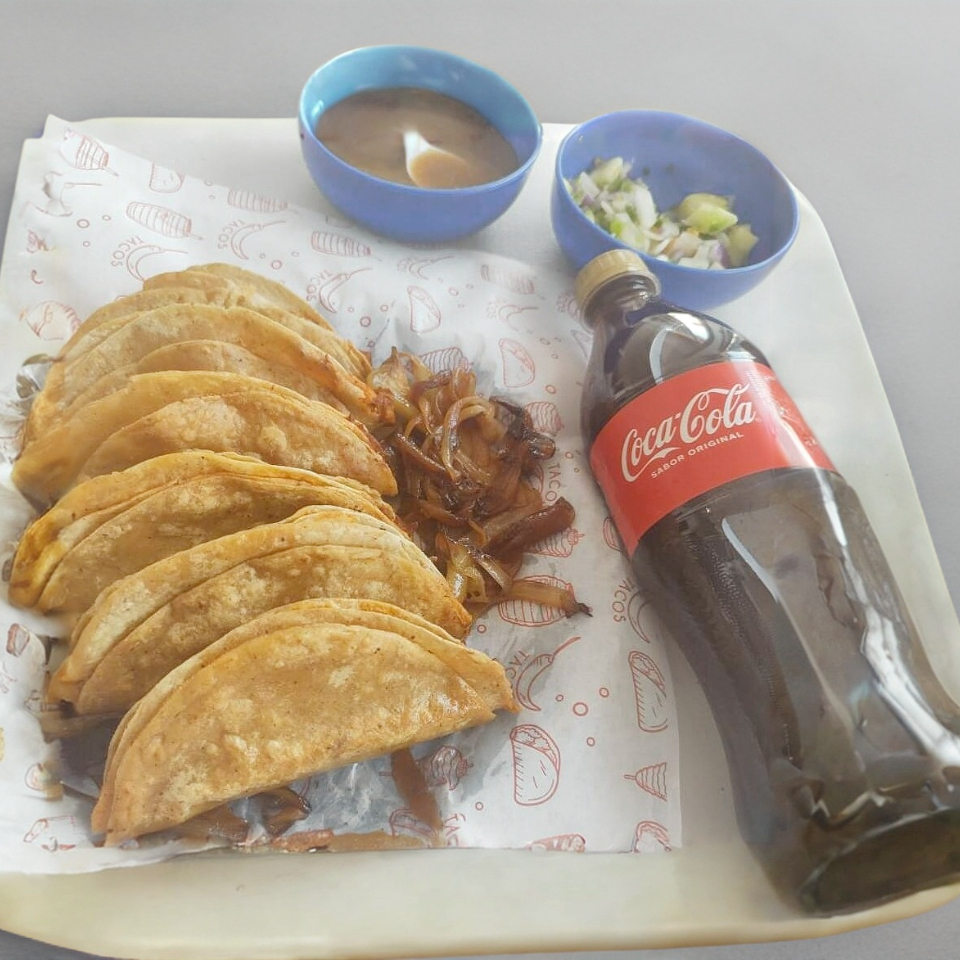 6 tacos dorados o blandos, 1 un refresco de 600 ml coca cola