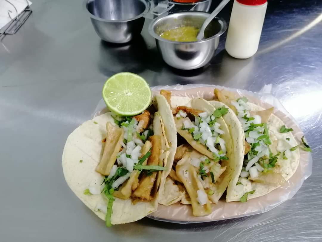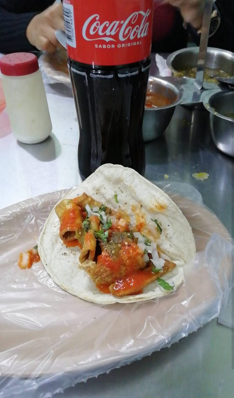 Taco de tripa de res dorada, tortilla normal, acompañado con cilantro y cebolla cruda