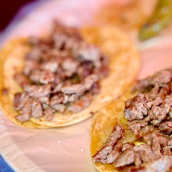 Taco de arrachera marinada con tortilla de maíz, corte de carne de res jugoso y tierno, a la parrilla.