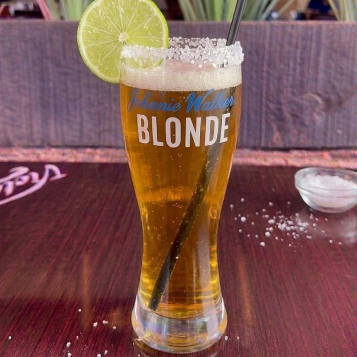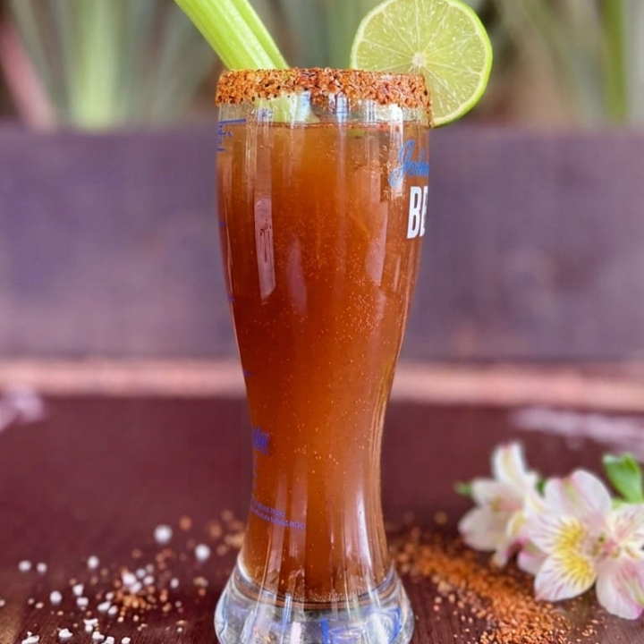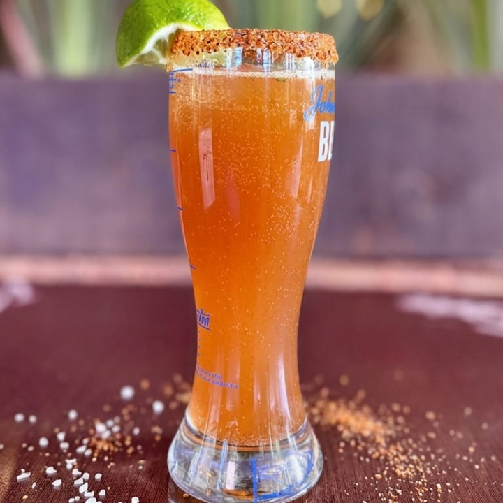 Bebida con cerveza, mezcla especial de salsas, clamato, jugo de limón y sal, con una rodaja de limón y escarchado de chile.