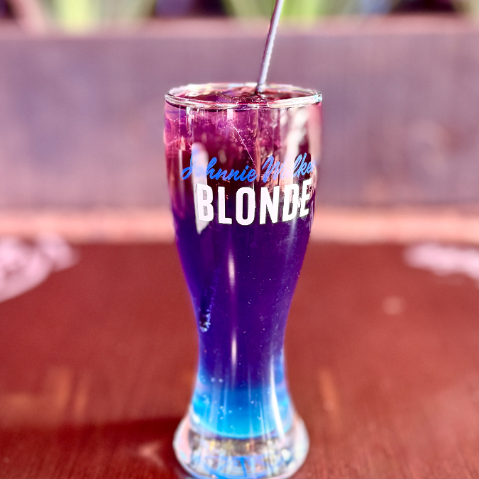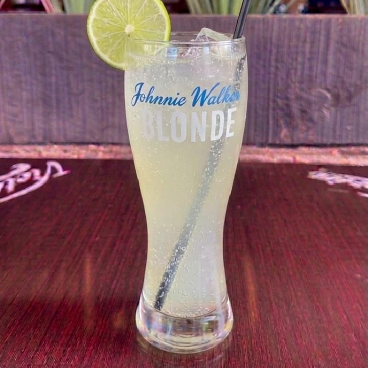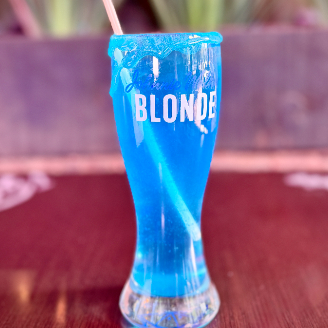Bebida con Tequila, refresco de limón, toque de curazao y bebida energética, con escarchado especial de chamoy azul y polvo azul.