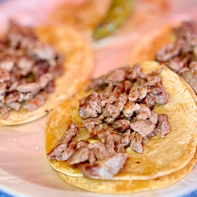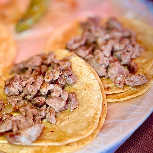 Taco de Bistec con tortilla de maíz, carne de res a la plancha, sazonada con sal y pimienta.