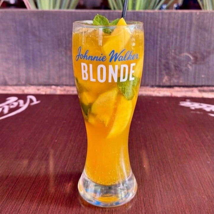 Bebida con Ron, mango natural, hierbabuena fresca, jugos cítricos naturales con un toque de jarabe y azucar