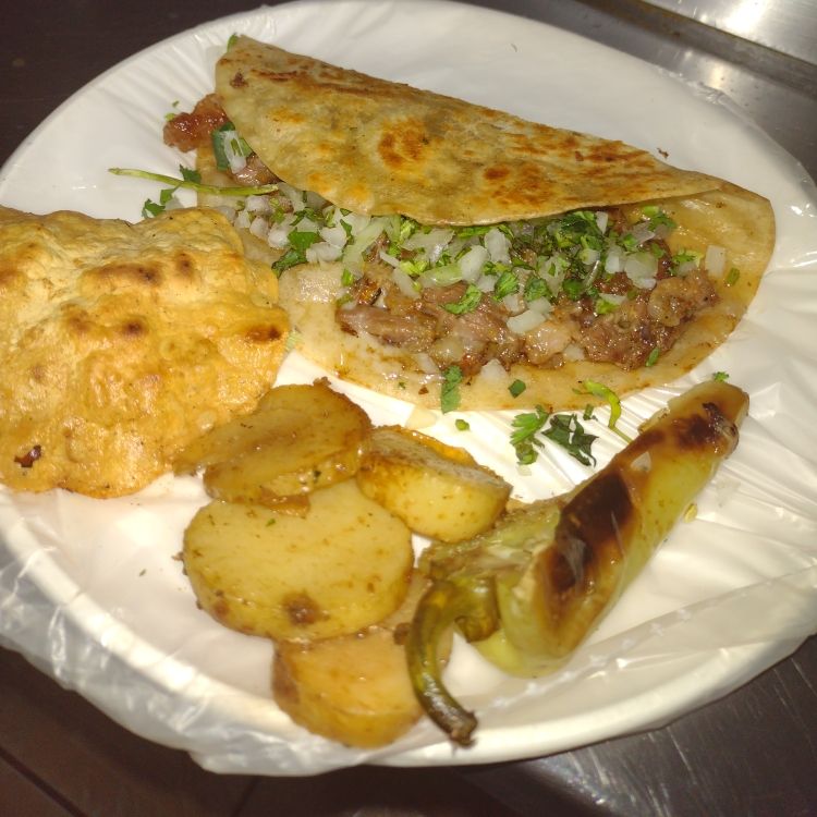 Suadero de res queso doble tortilla de harina partida a la mitad verdura (cilantro y cebolla ) cebolla frita rábanos o jícama o pepinos Chile toreado tostaditas y sus salsas (verduras y salsas se las ponemos a parte para prepararlas al gusto)