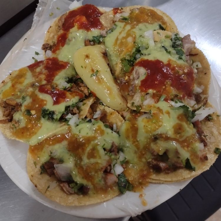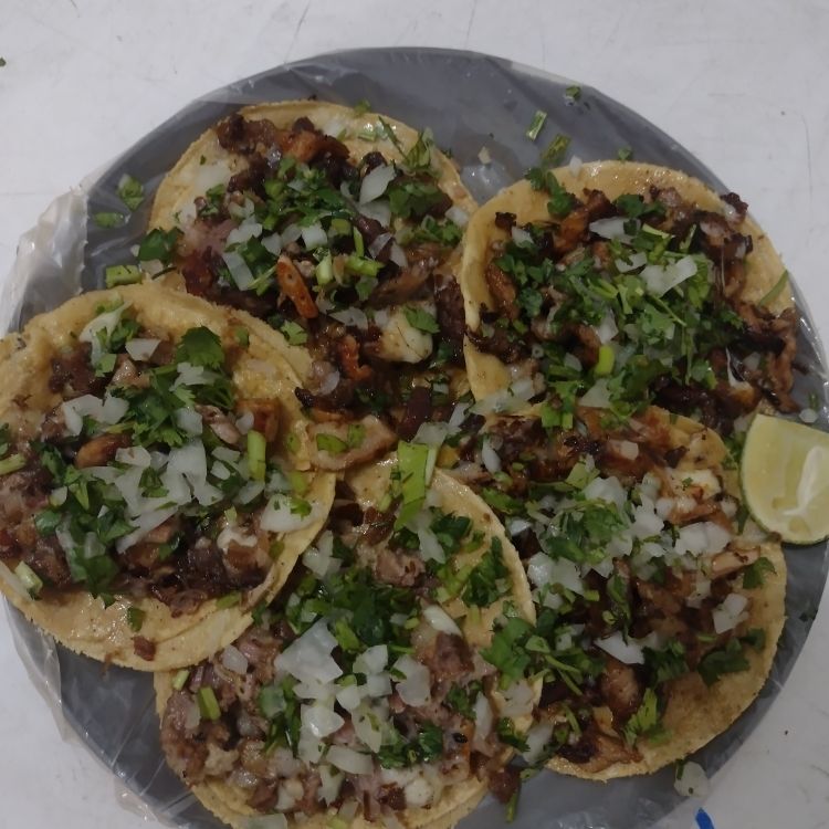Taco de Pastor lleva verdura (cilantro y cebolla ) cebolla frita rábanos o jícama o pepinos Chile toreado tostaditas y sus salsas (verduras y salsas se las ponemos a parte para prepararlas al gusto)