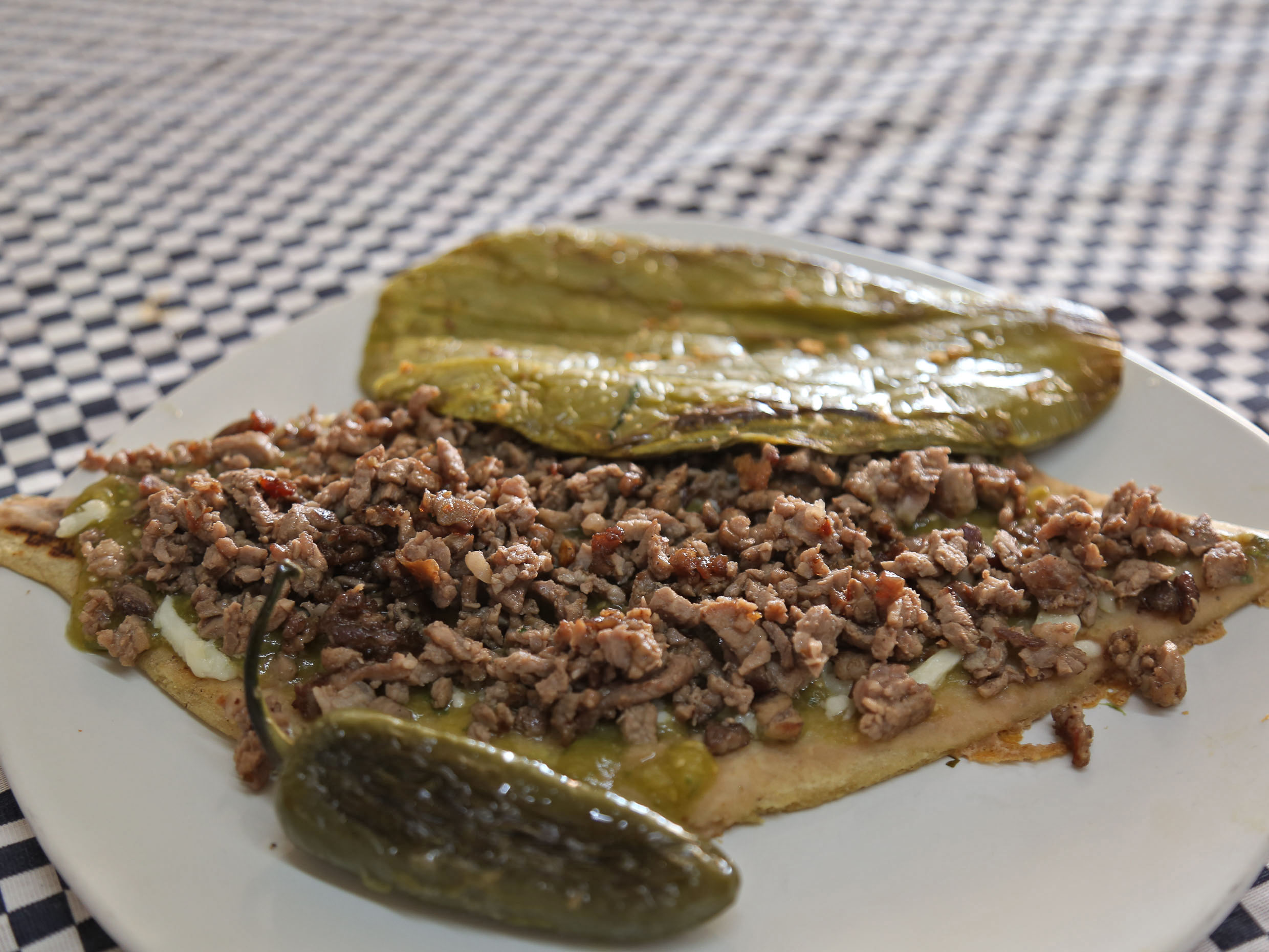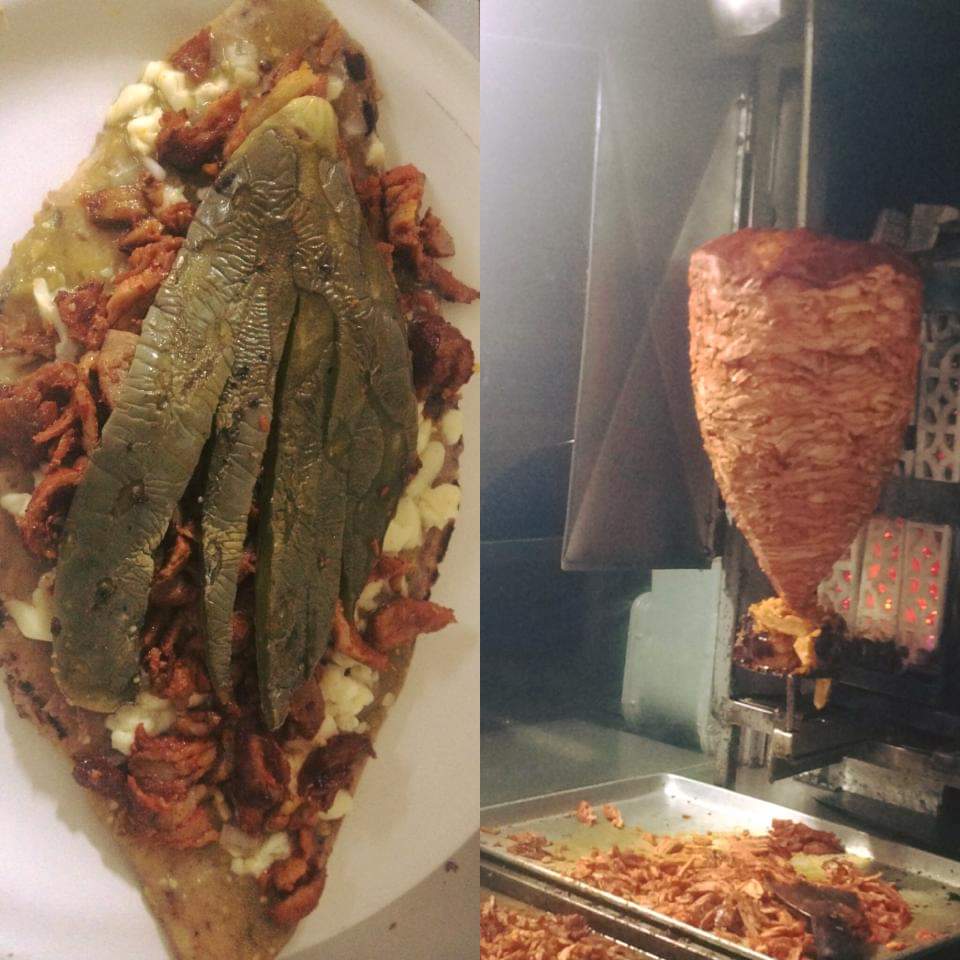 Gringa: Quesadilla de harina con carne al pastor y piña, acompañada de verduras y salsas por aparte.