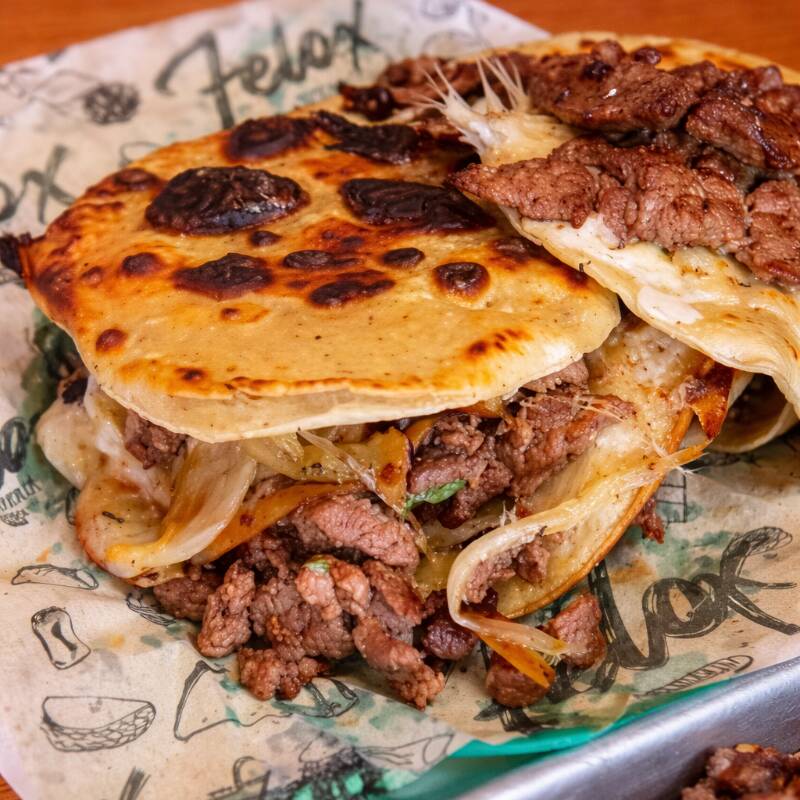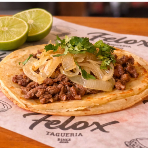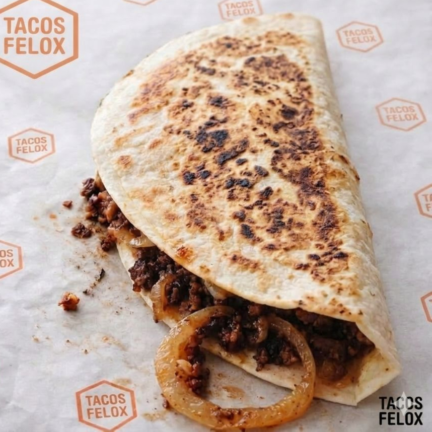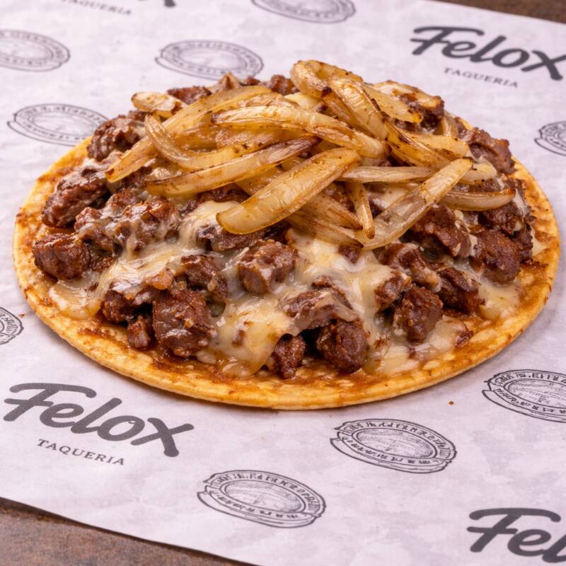 TORTILLA DORADA CON QUESO Y CARNE DE ARRACHERA ACOMPAÑADO DE CEBOLLA FRITA CILANTRO LIMON PEPINO SALSA VERDE Y ROJA