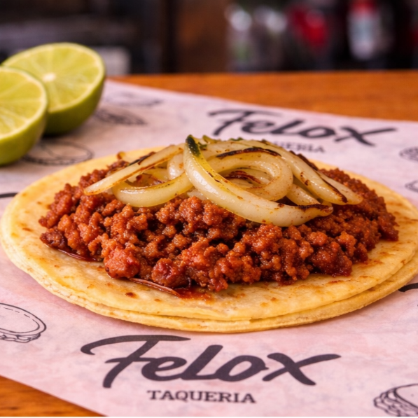 TORTILLA DORADA CON QUESO Y CARNE DE CHIRIZO ACOMPAÑADO DE CEBOLLA FRITA CILANTRO LIMON PEPINO SALSA VERDE Y ROJA