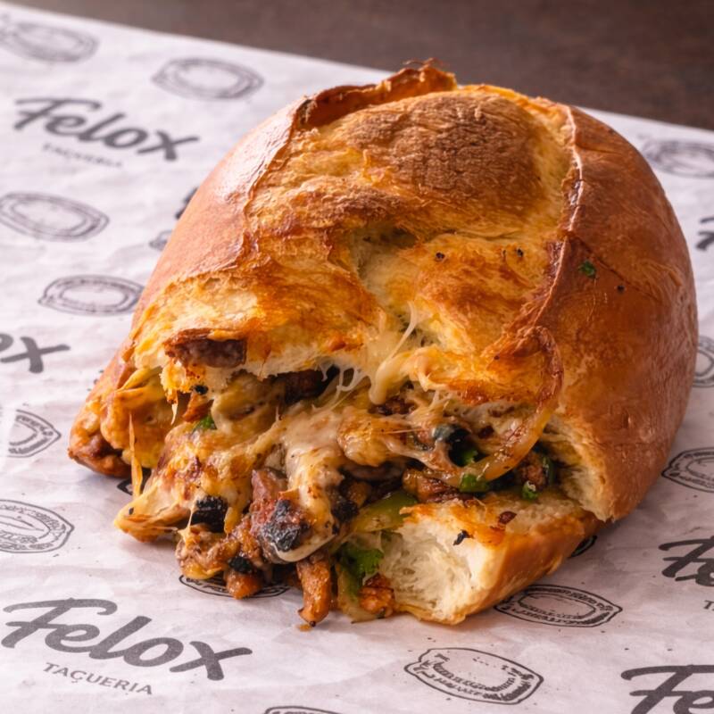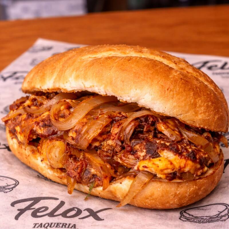 BOLILLO GRANDE ACOMPAÑADO DE CARNE DE BISTEC PASTOR CHORIZO QUESO SALSA ROJA CEBOLLA FRITA CILANTRO LIMON PEPINO