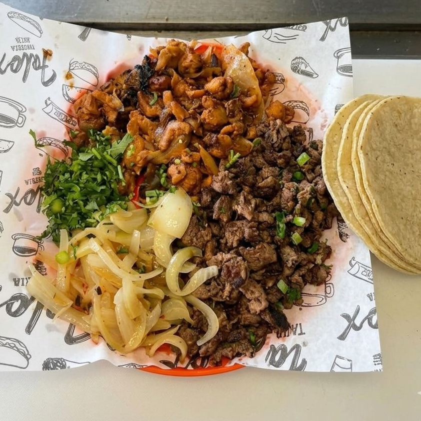 PLATO DE CARNE ARRACHERA Y COCHINITA ACOMPAÑADO DE CEBOLLA MORADA CILANTRO LIMON PEPINO SALSA VERDE Y ROJA