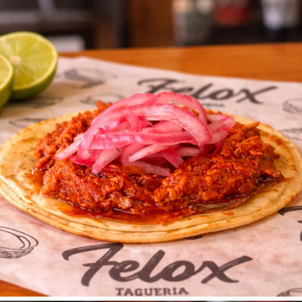 TORTILLA DORADA CON QUESO Y CARNE DE COCHINITA PIBIL ACOMPAÑADO DE CEBOLLA MORADA LIMON PEPINO SALSA VERDE Y ROJA