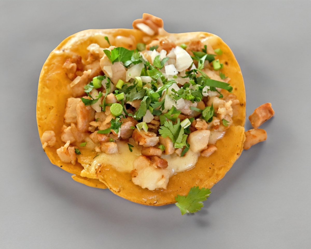 Tortilla dorada con queso y carne.