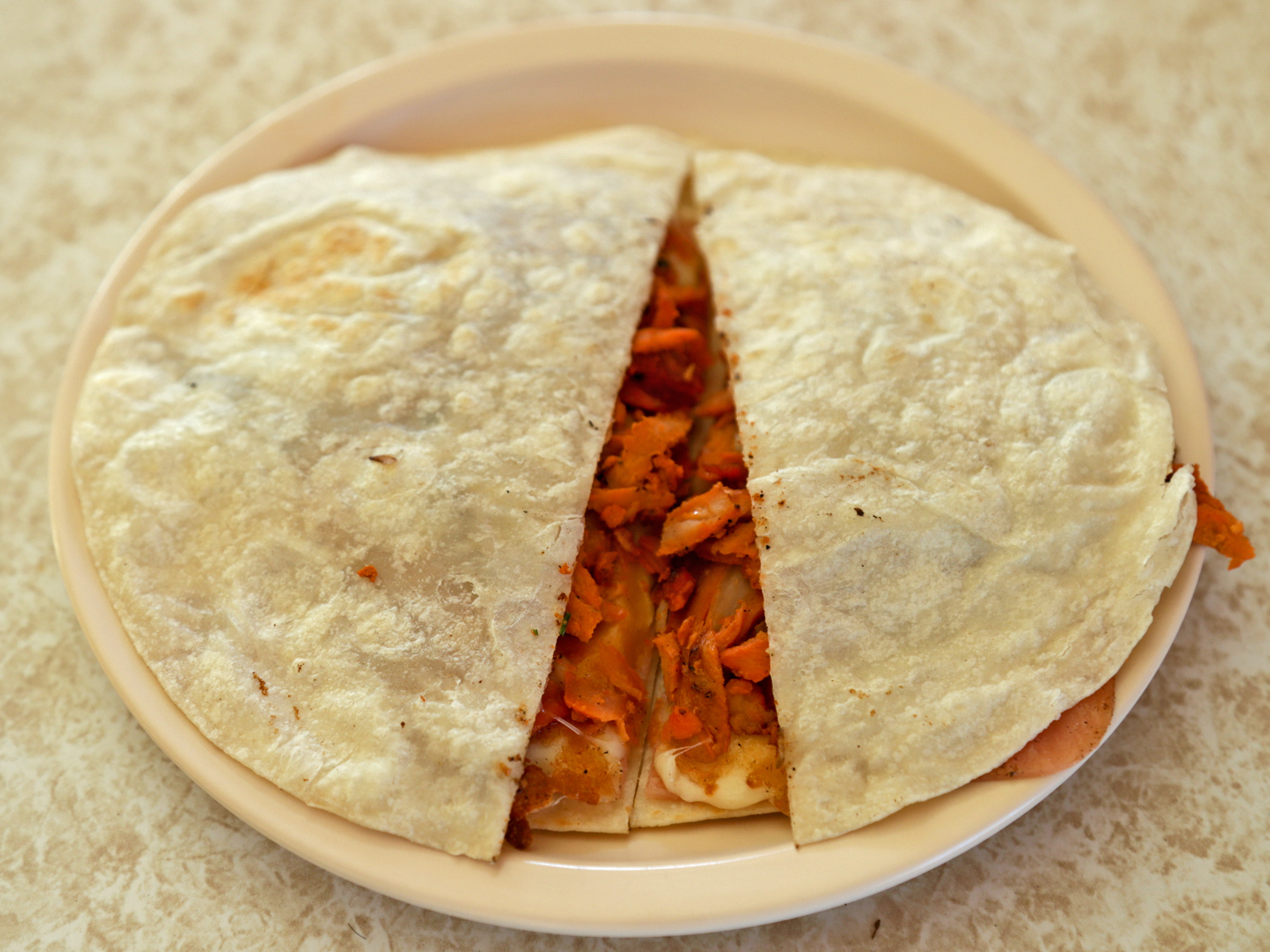 Una tortilla de harina, tamaño normal con queso y carne.