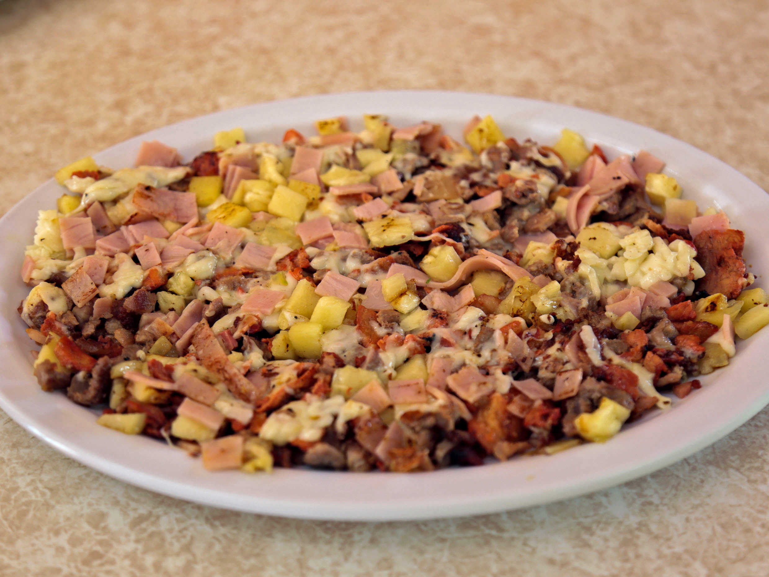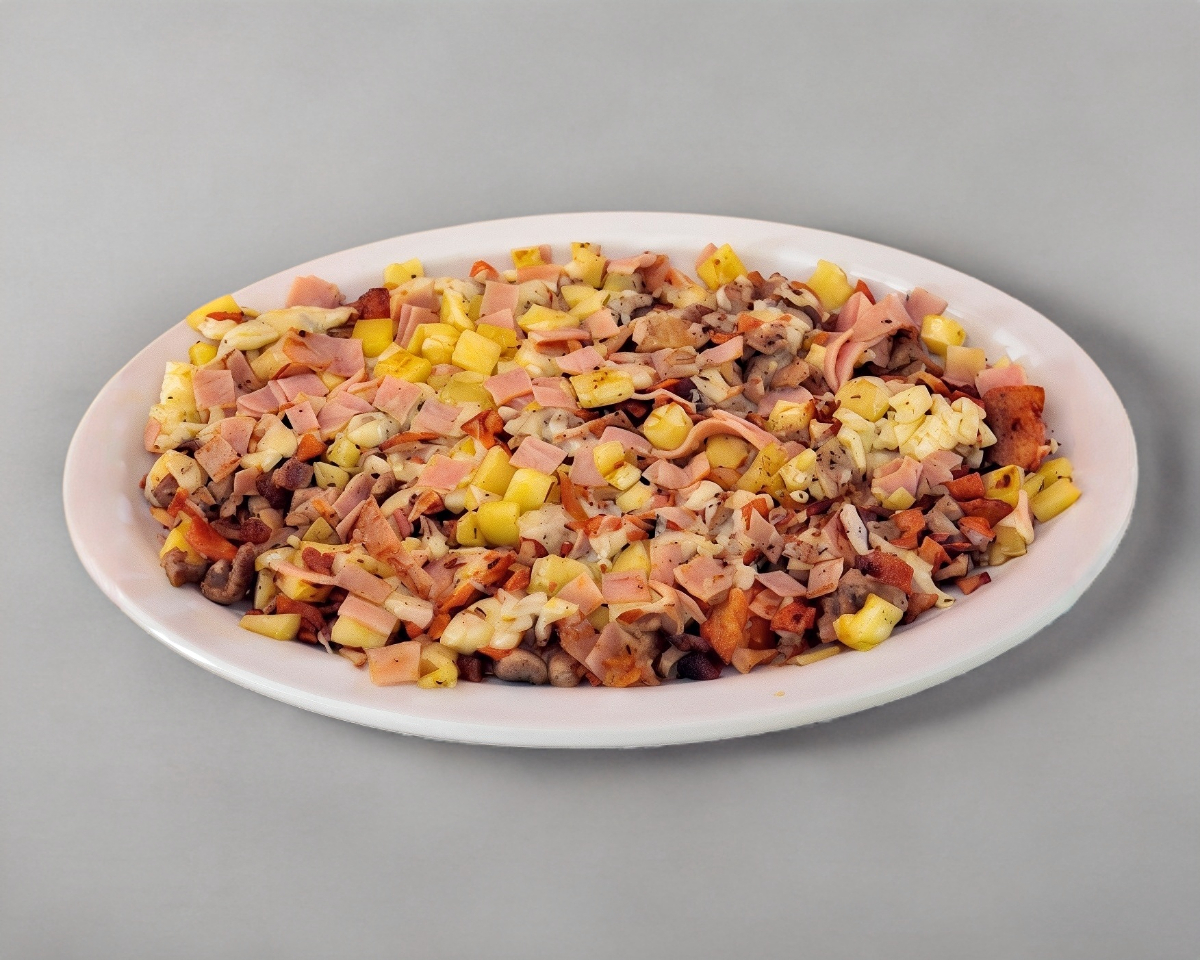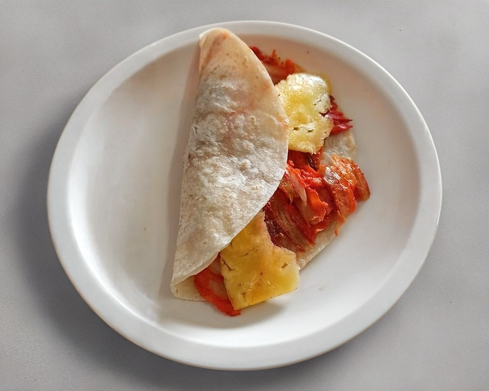Pimiento morrón, cebolla, tocino, champiñones, piña, queso y tortillas de maíz.