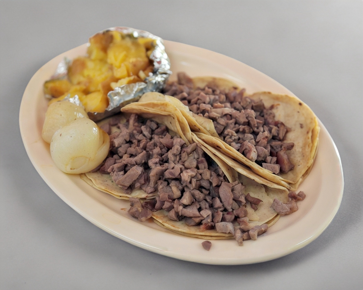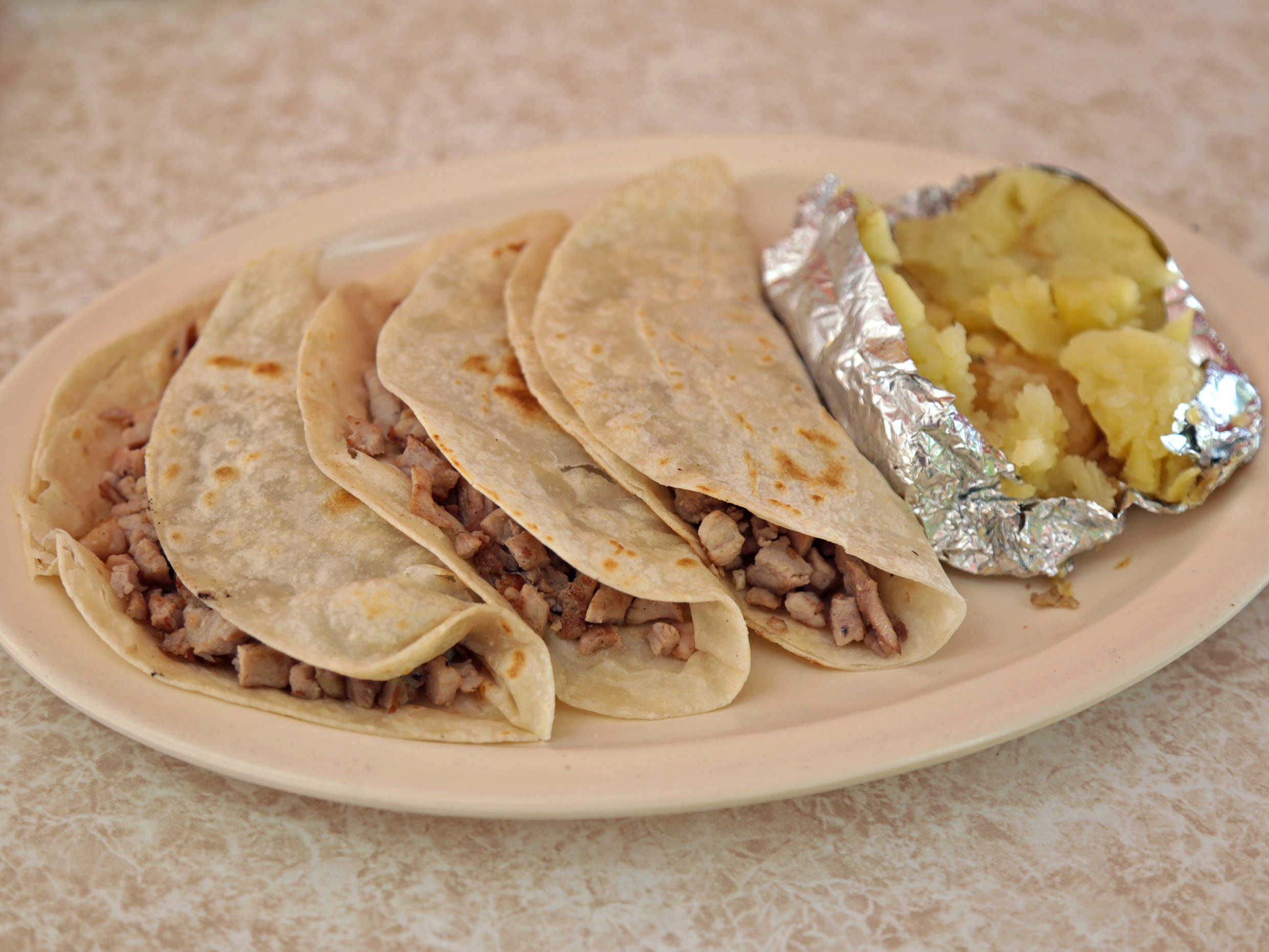 3 Tacos, papa con mantequilla y cebollitas.