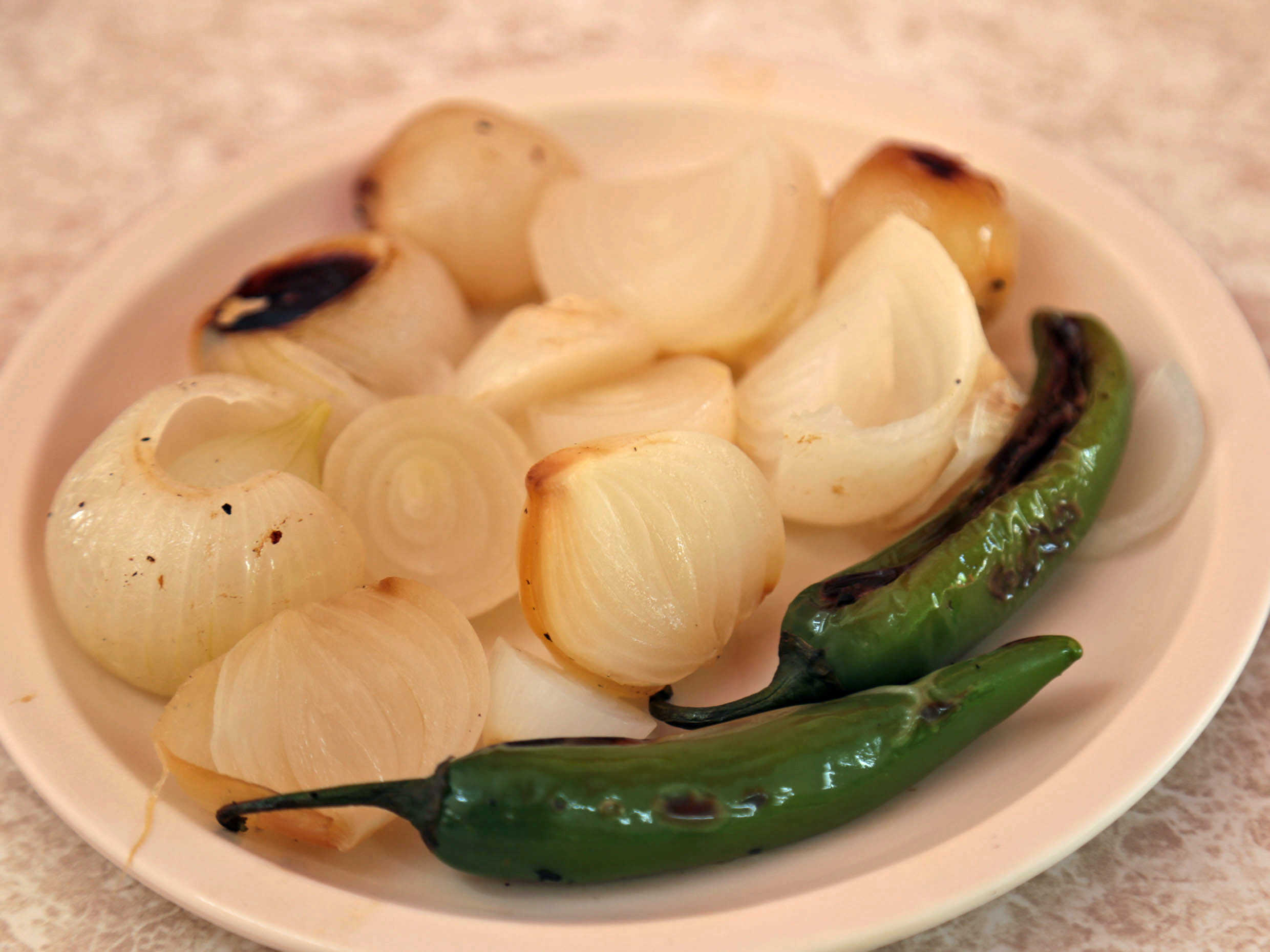 Pimiento morrón, cebolla, tocino, carne, queso y tortillas de maiz.