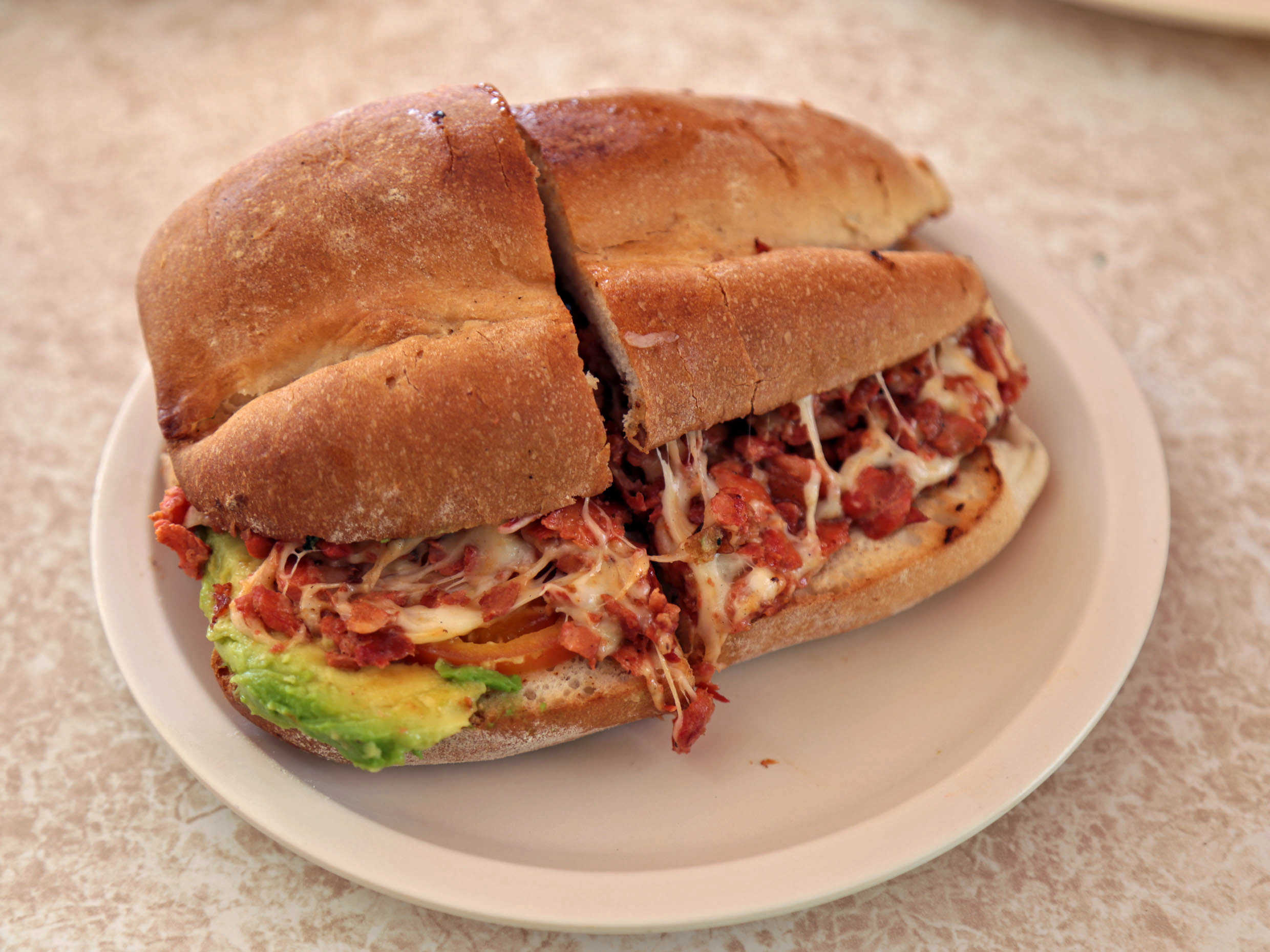 Lleva mayonesa, aguacate, jitomate, cebolla y queso.