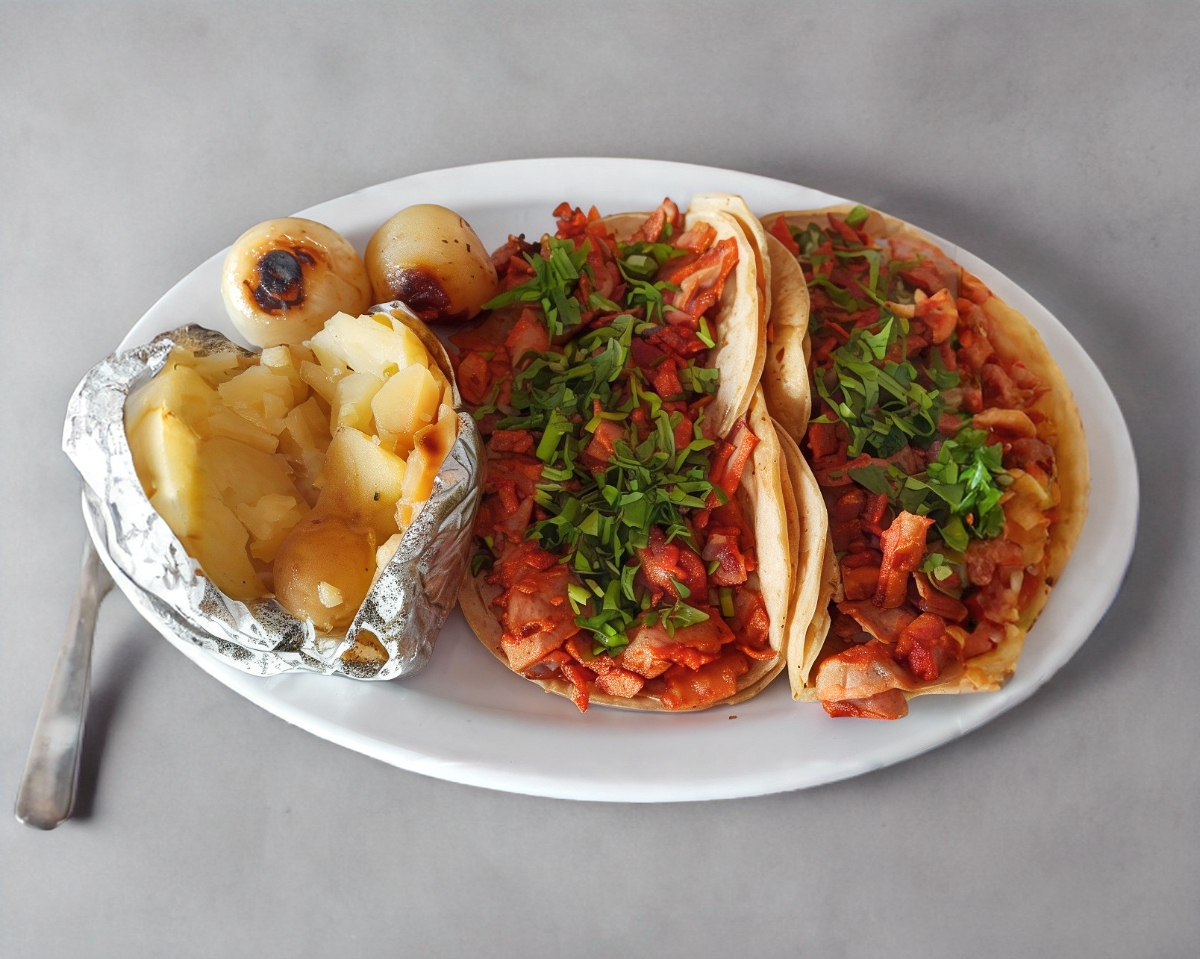 4 Tacos, papa con mantequilla y cebollitas.