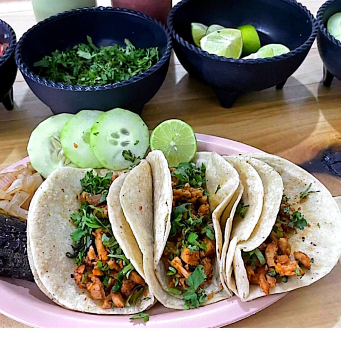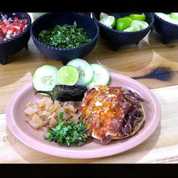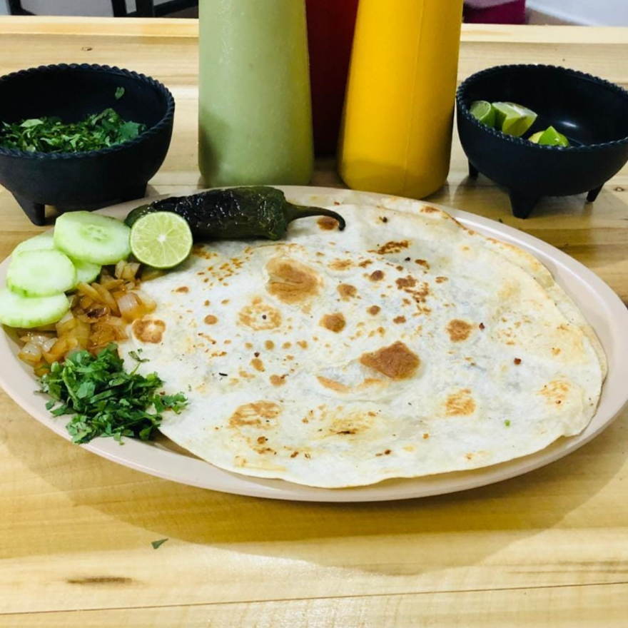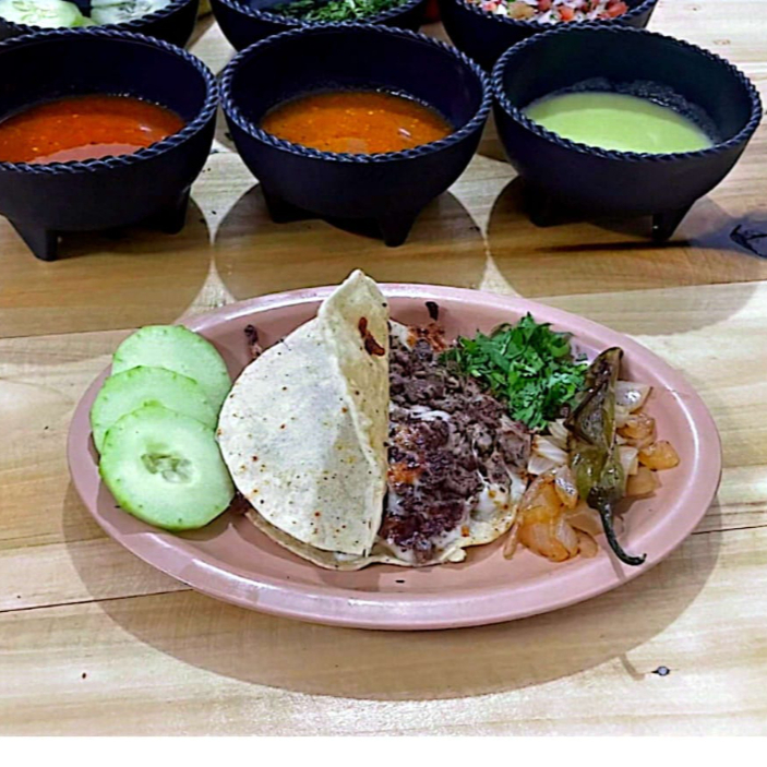 2pzs tortilla de maiz carne a (elegir) queso cebolla sada cilantro chile asado salsa al gusto
