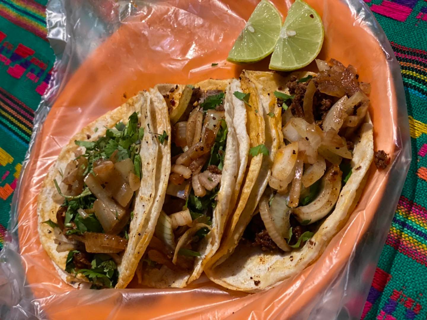 Incluye tortillas calientes, salsa roja, salsa.verde, cebolla y cilantro
