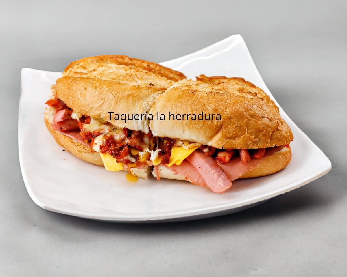 Pastor, chorizo, jamón, queso amarillo, queso asadero, bolillo tira completa.