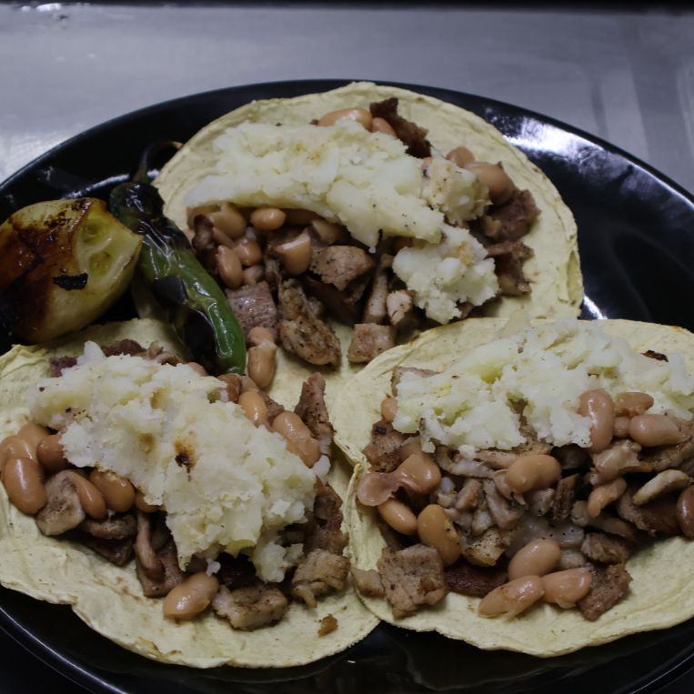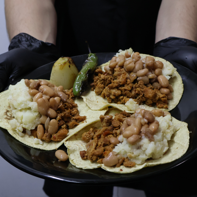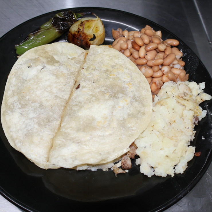 Tortilla de maíz grande, carne adobada, papa y frijol