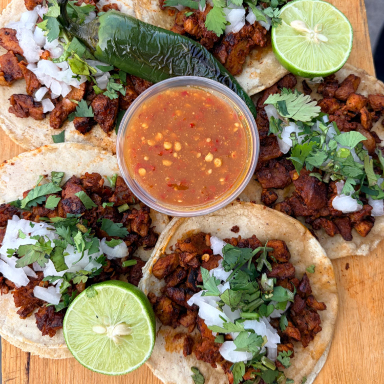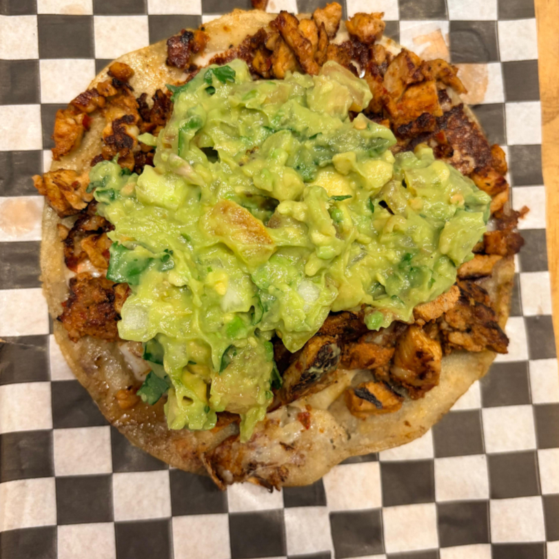 TACO GRANDE DE PASTOR JUGOSO CON DOBLE TORTILLA, GUACAMOLE RECIÉN HECHO Y COSTRA DE QUESO ASADERO