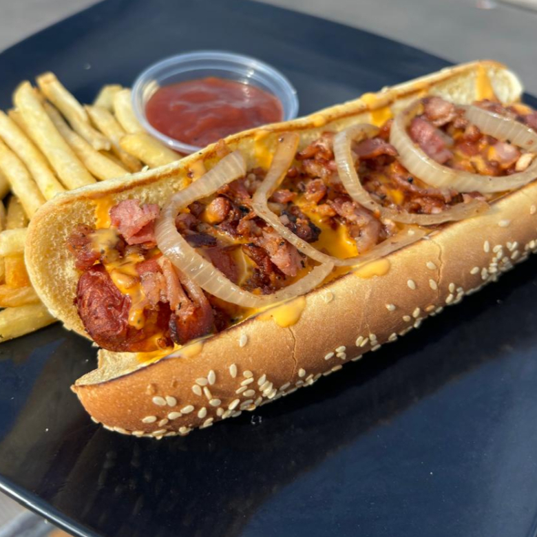 HOTDOG JUMBO DE 20CM CON QUESO AMARILLO, TOCINO Y CEBOLLA ACOMPAÑADOS CON PAPAS A LA FRANCESA