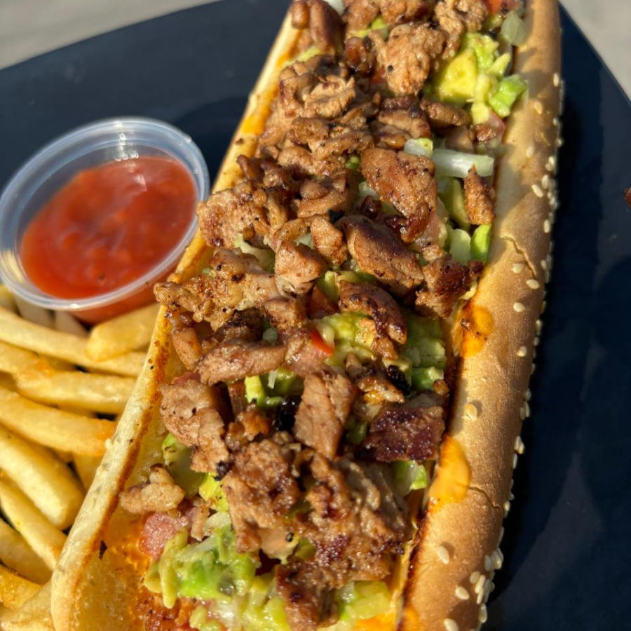 HOTDOG JUMBO DE 20CM CON GUACAMOLE DE LA CASA, BISTECK DE RES Y PAPAS A LA FRANCESA