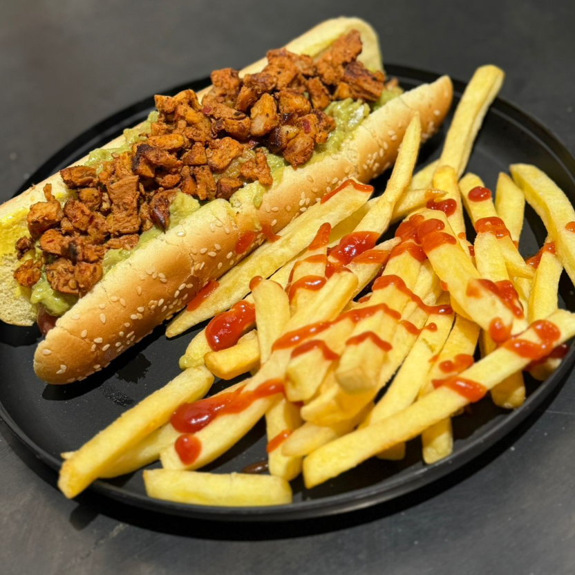 HOTDOG JUMBO 20CM CON PASTOR, GUACAMOLE DE LA CASA Y PAPAS A LA FRANCESA
