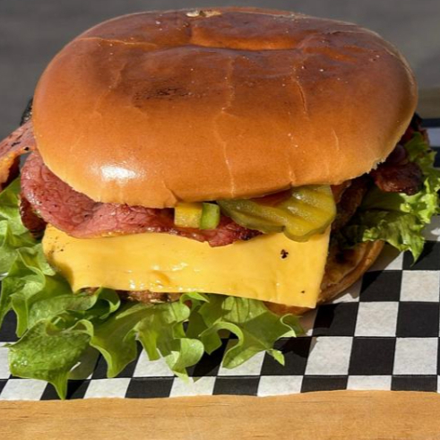 HAMBURGUESA DE ARRACHERA 150GR, QUESO AMRILLO, TOCINO, PEPINILLOS, LECHUGA Y JITOMATE CON PAPAS A LA FRANCESA