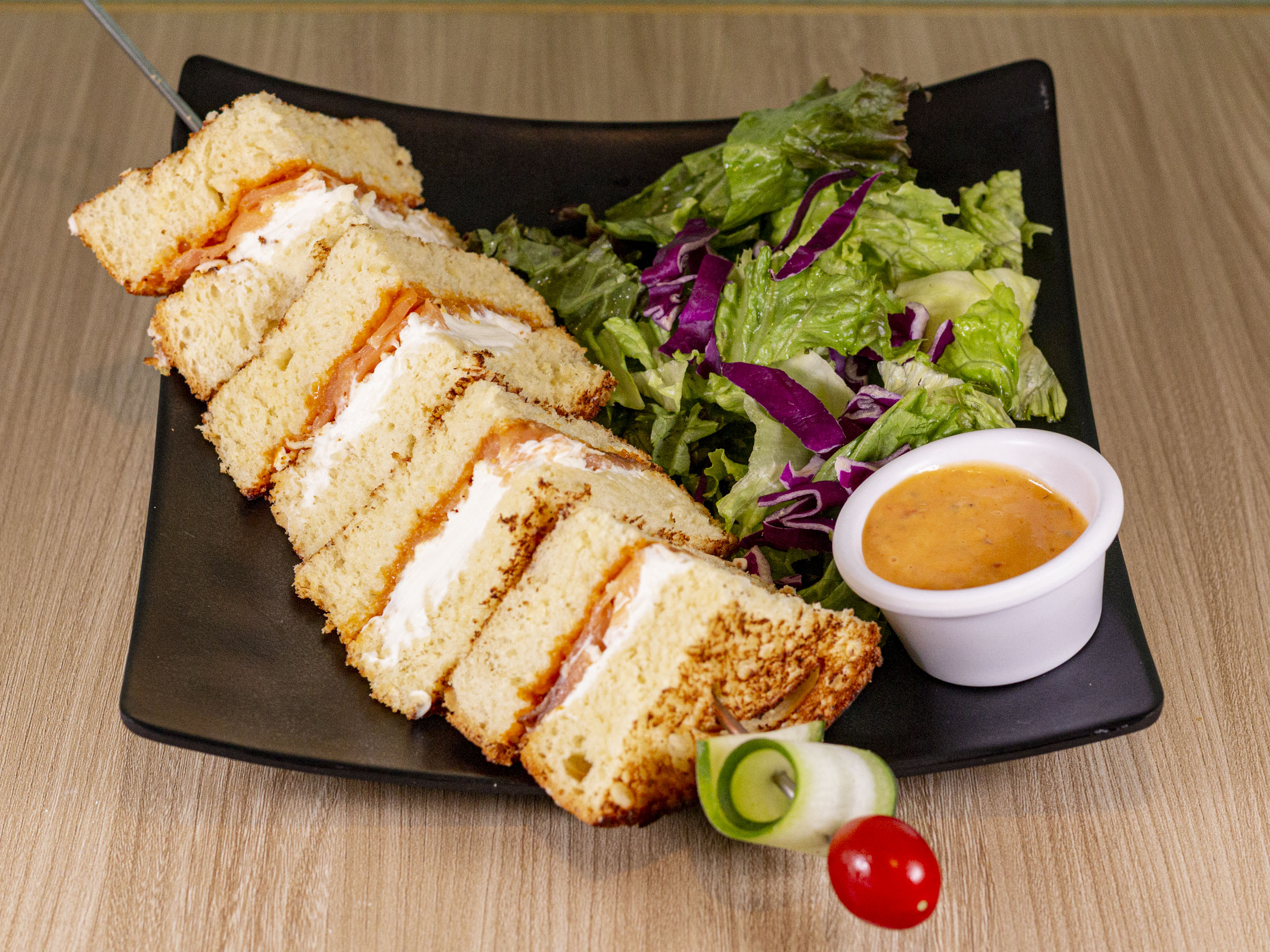 Salmón ahumado, queso crema, lechuga, col morada y aderezo