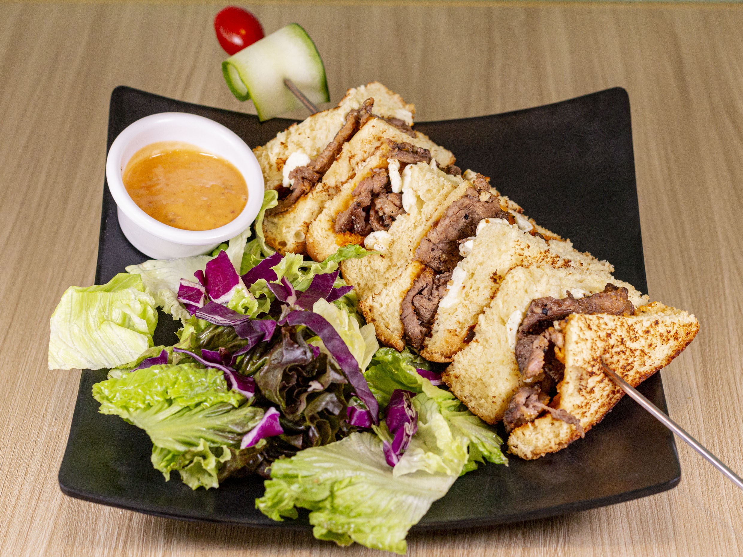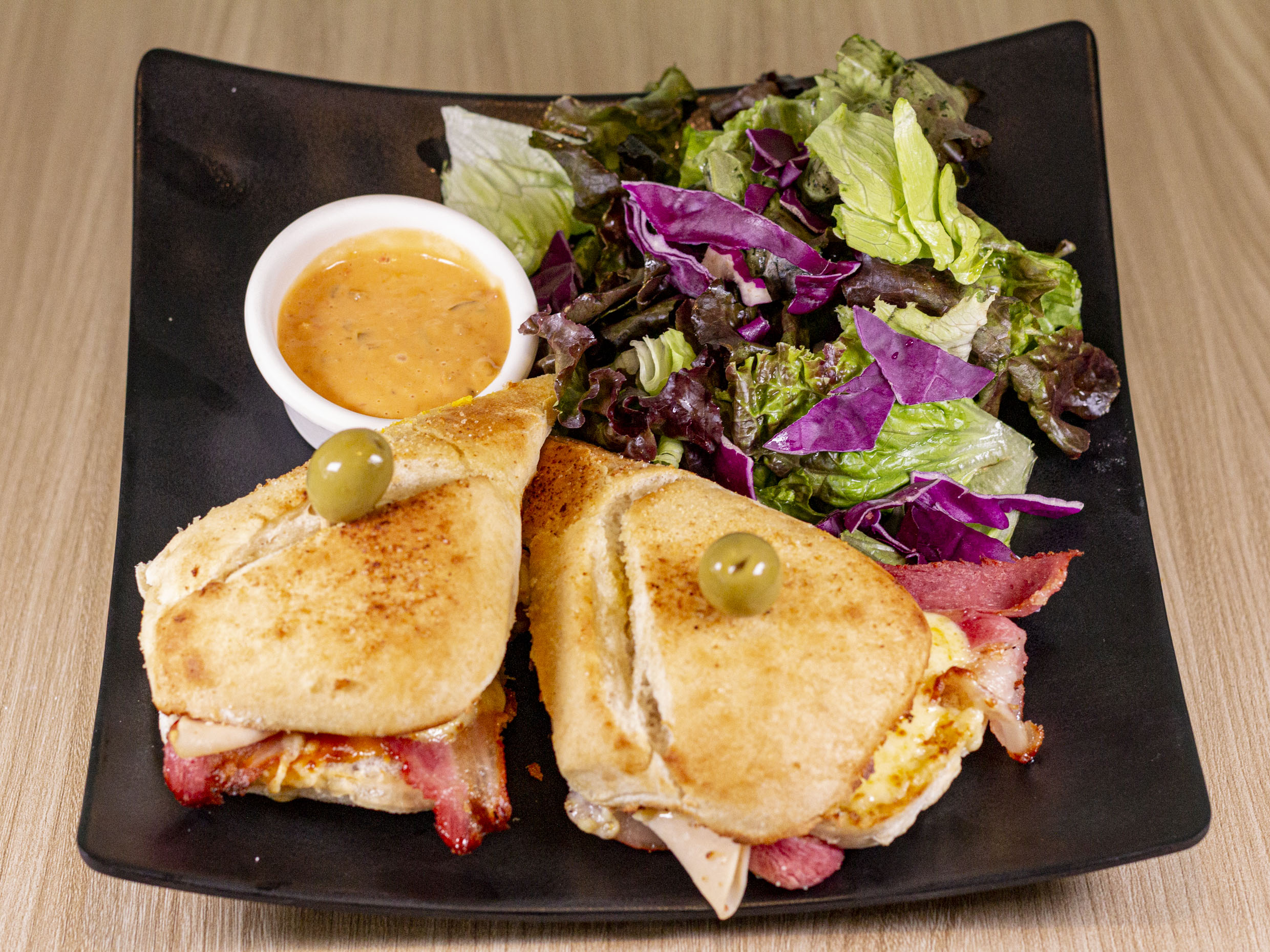 Jamón de pavo, mix de quesos, lechuga, col morada y aderezo.