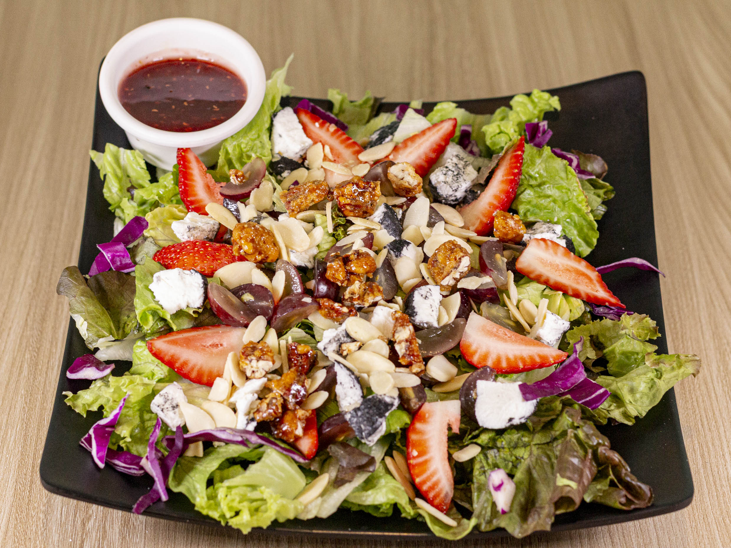 Ensalada de Uva roja, fresa, queso de cabra, almendras y nuez tostada. Acompañado con aderezo de frambuesa.