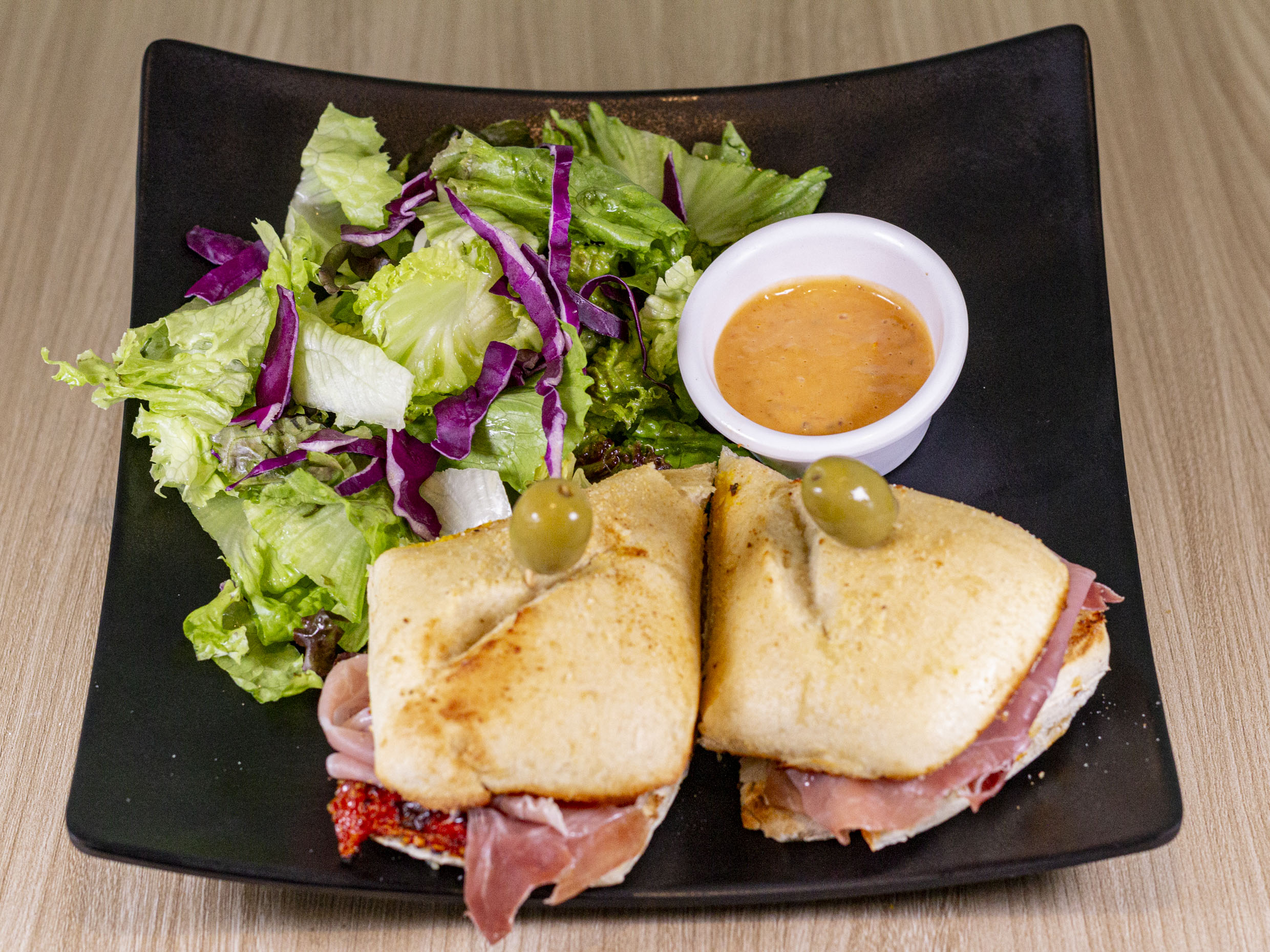 Jamón serrano, queso gouda, tomate, lechuga, col morada y aderezo.