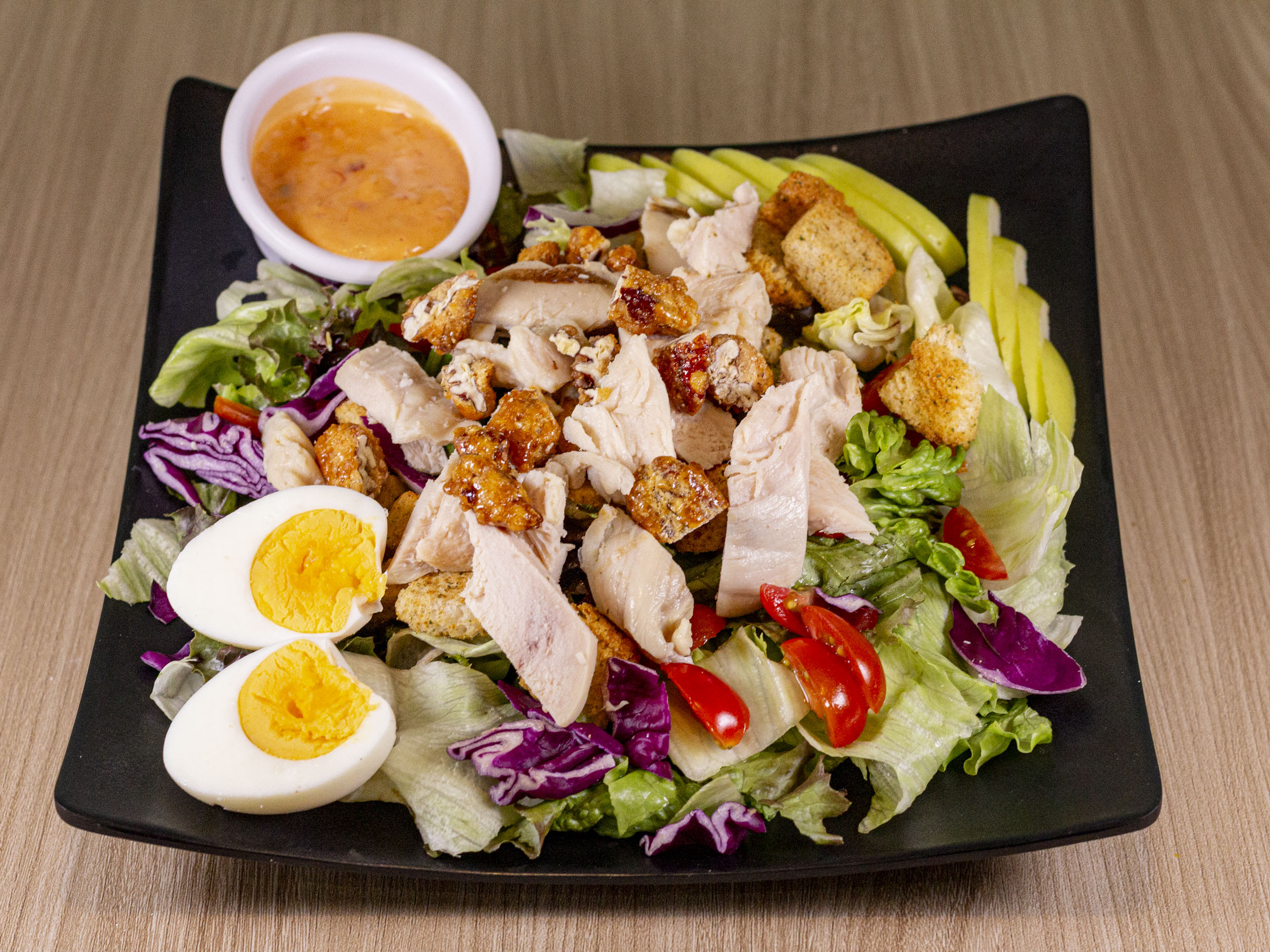 Ensalada de Pechuga de pollo a la plancha, huevo cocido, tomates cherry, manzana fresca, acompañado con aderezo mil islas.