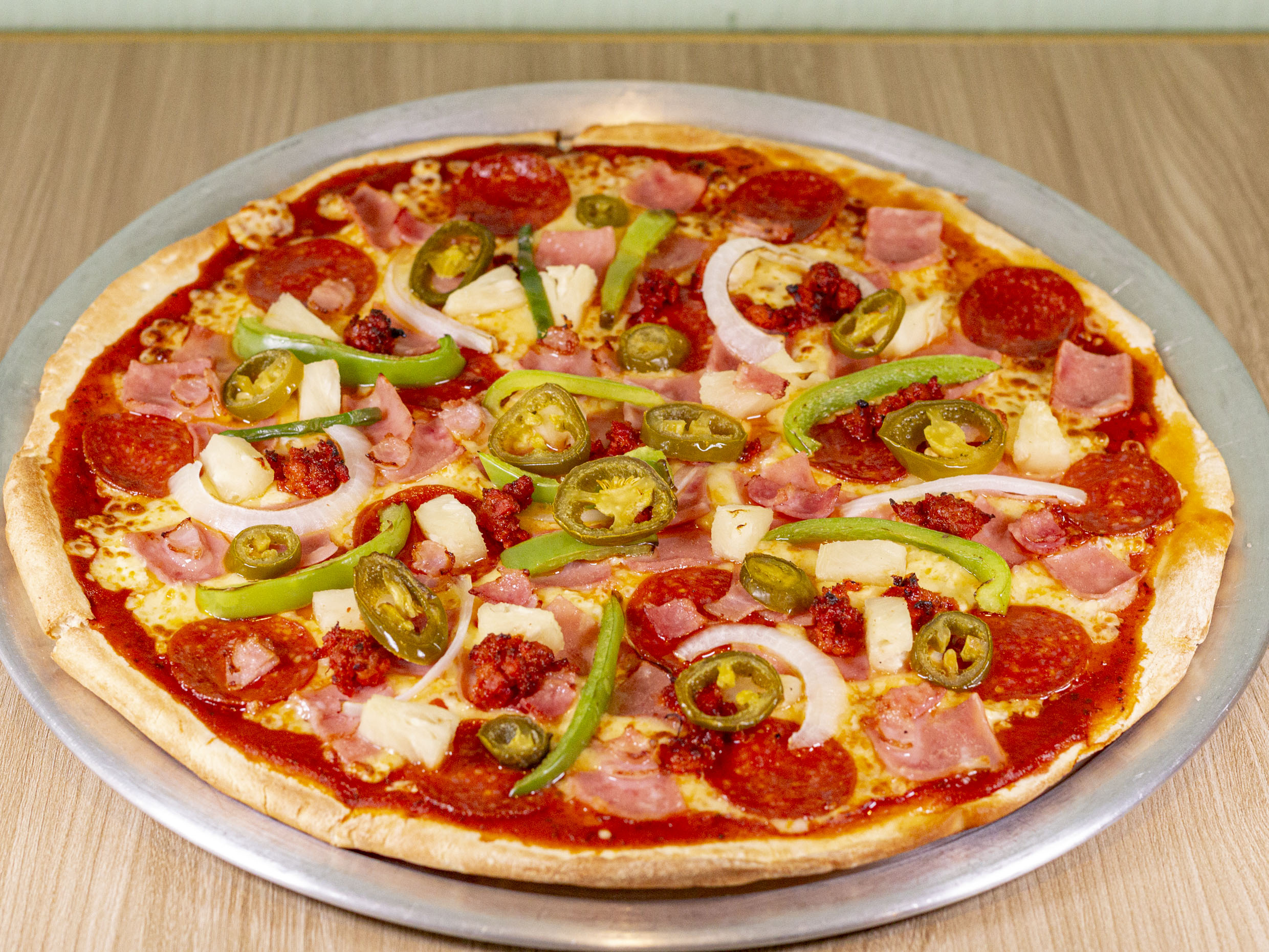 pepperoni, chorizo, jamón de pierna, tocino, piña, cebolla morada, jalapeño, pimiento verde