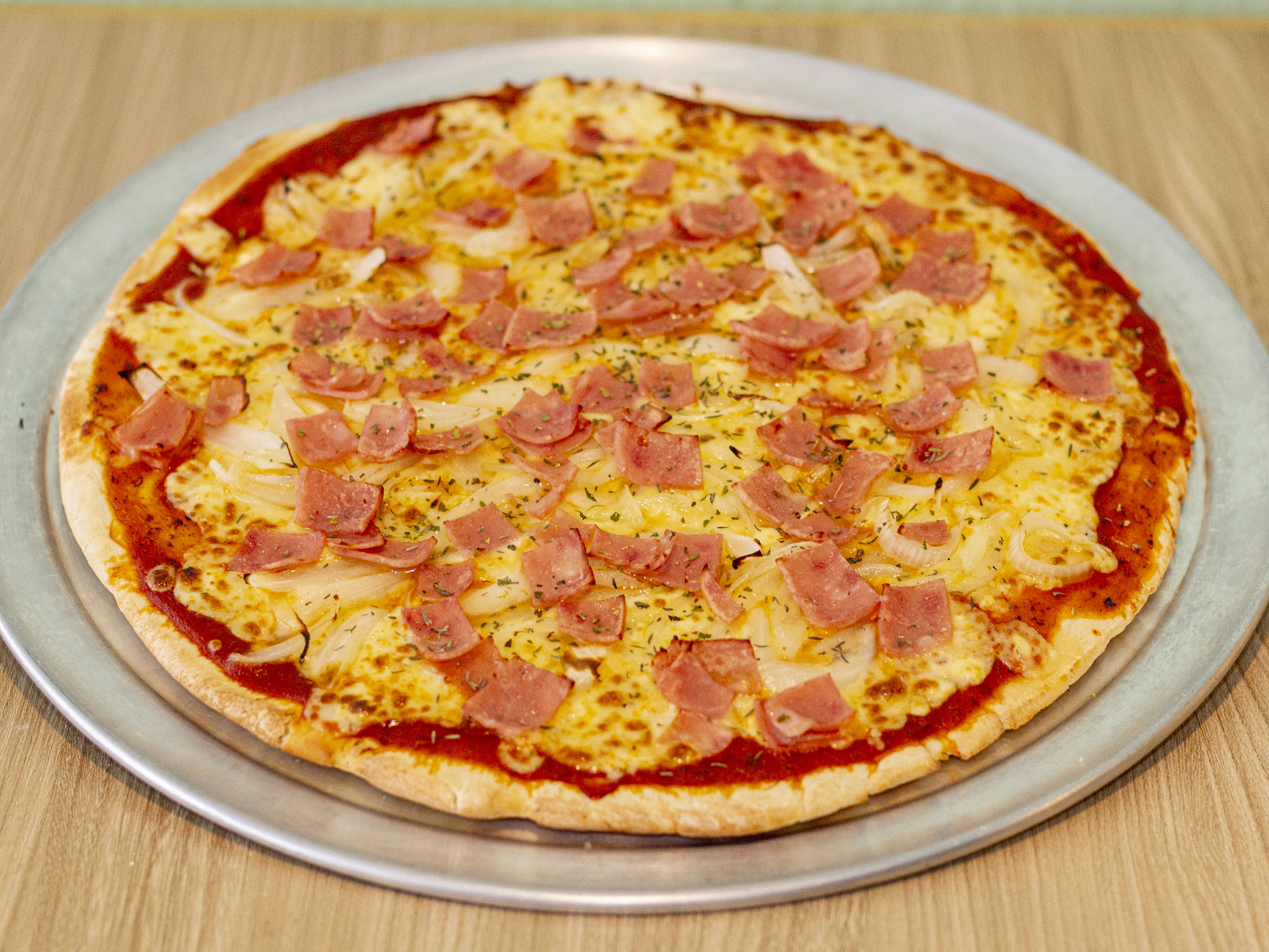 Pizza de Jamón de pierna, mix de queso, cebolla, tomillo y albahaca.