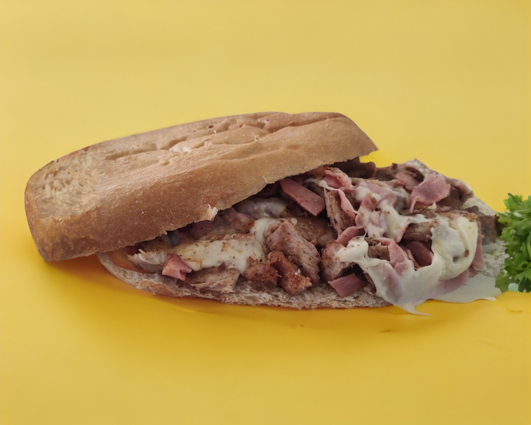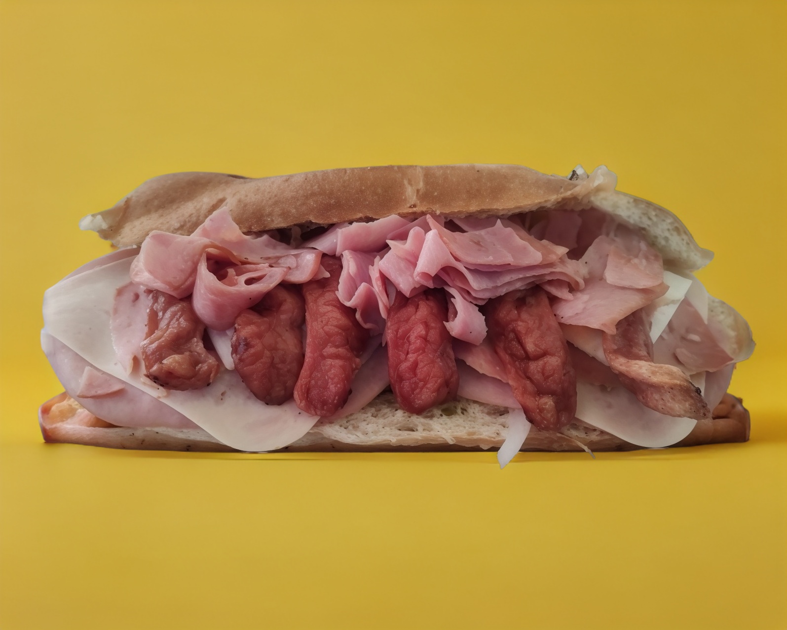 Pechuga de pavo, pierna ahumada, pastel pimiento, queso panela, jamón, queso manchego y salchicha (Todas nuestras tortas llevan Aguacate, Jitomate, Cebolla, Chile y Aderezo)
