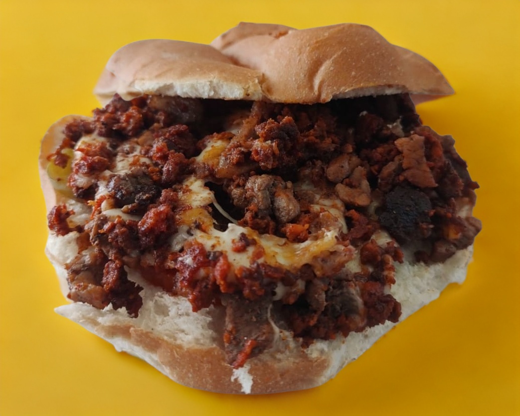 Bistec de res, adobada y queso asadero. (Todas nuestras tortas llevan Aguacate, Jitomate, Cebolla, Chile y Aderezo)