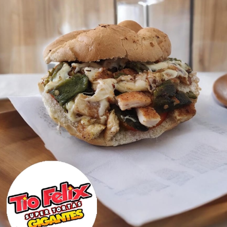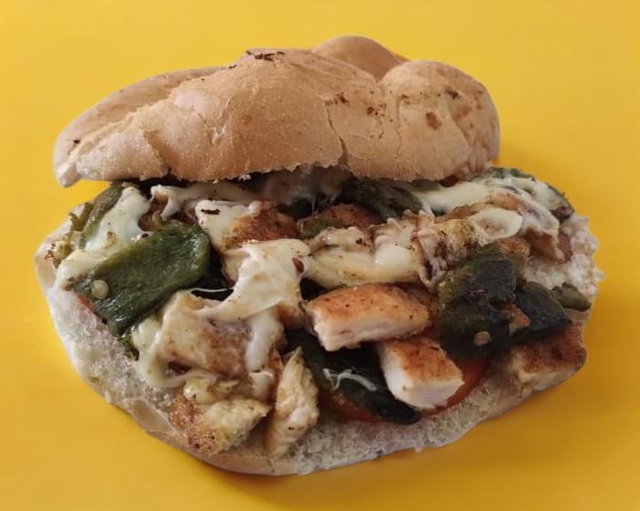 Pollo asado, rajas poblano y champiñones (Todas nuestras tortas llevan Aguacate, Jitomate, Cebolla, Chile y Aderezo)