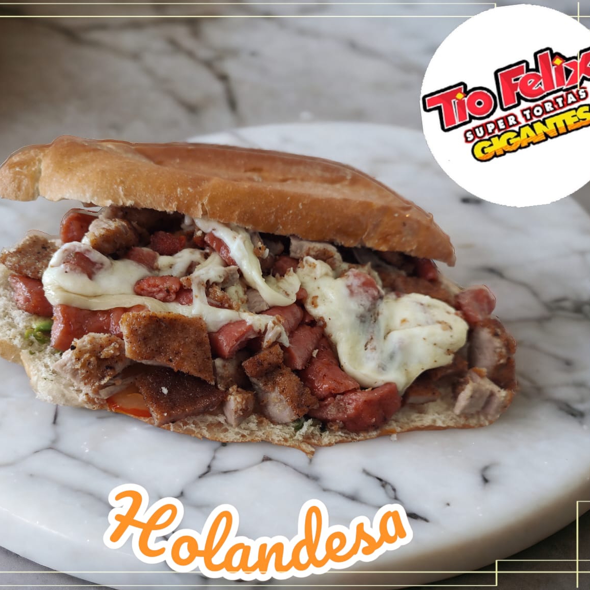 Pierna ahumada, milanesa de cerdo, queso de puerco, salchicha, queso amarillo, huevo con chorizo, jamón, manchego y asadero (Todas nuestras tortas llevan Aguacate, Jitomate, Cebolla, Chile y Aderezo)