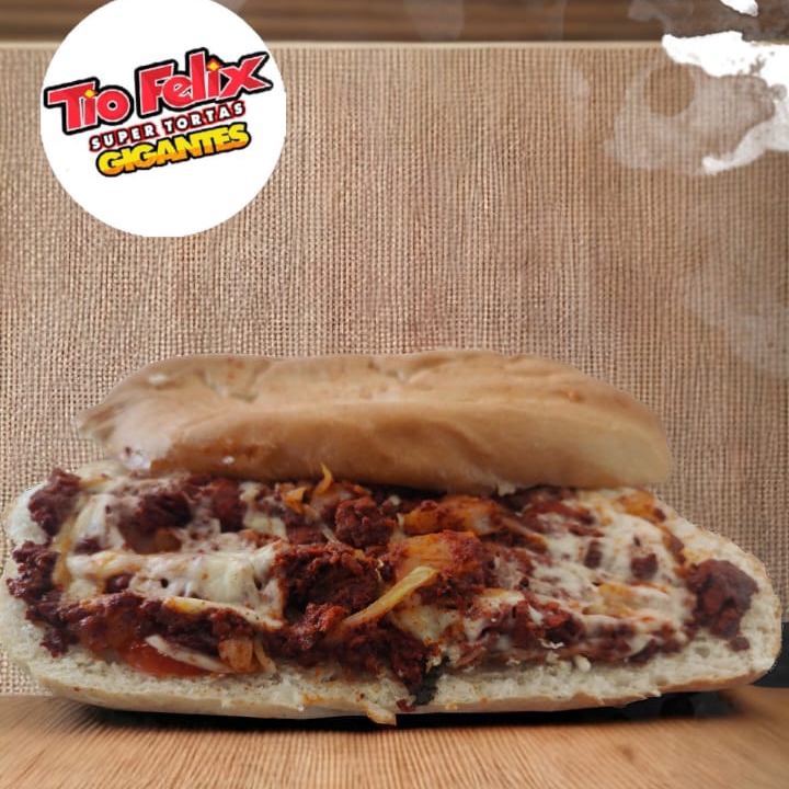 Adobada, bistec de res y queso asadero (Todas nuestras tortas llevan Aguacate, Jitomate, Cebolla, Chile y Aderezo)