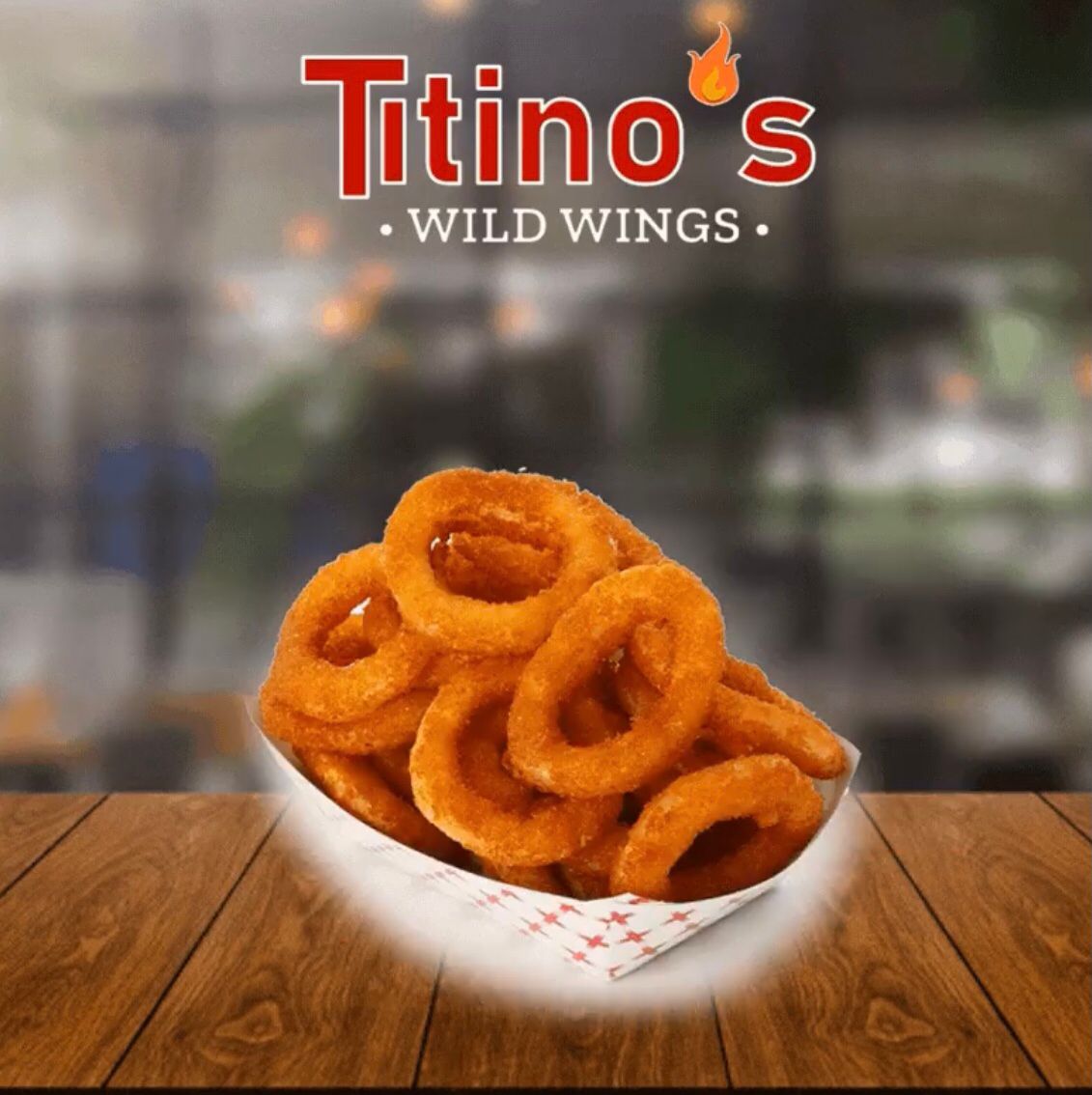 10 Aros de cebolla con chimichurri picosito de la casa.