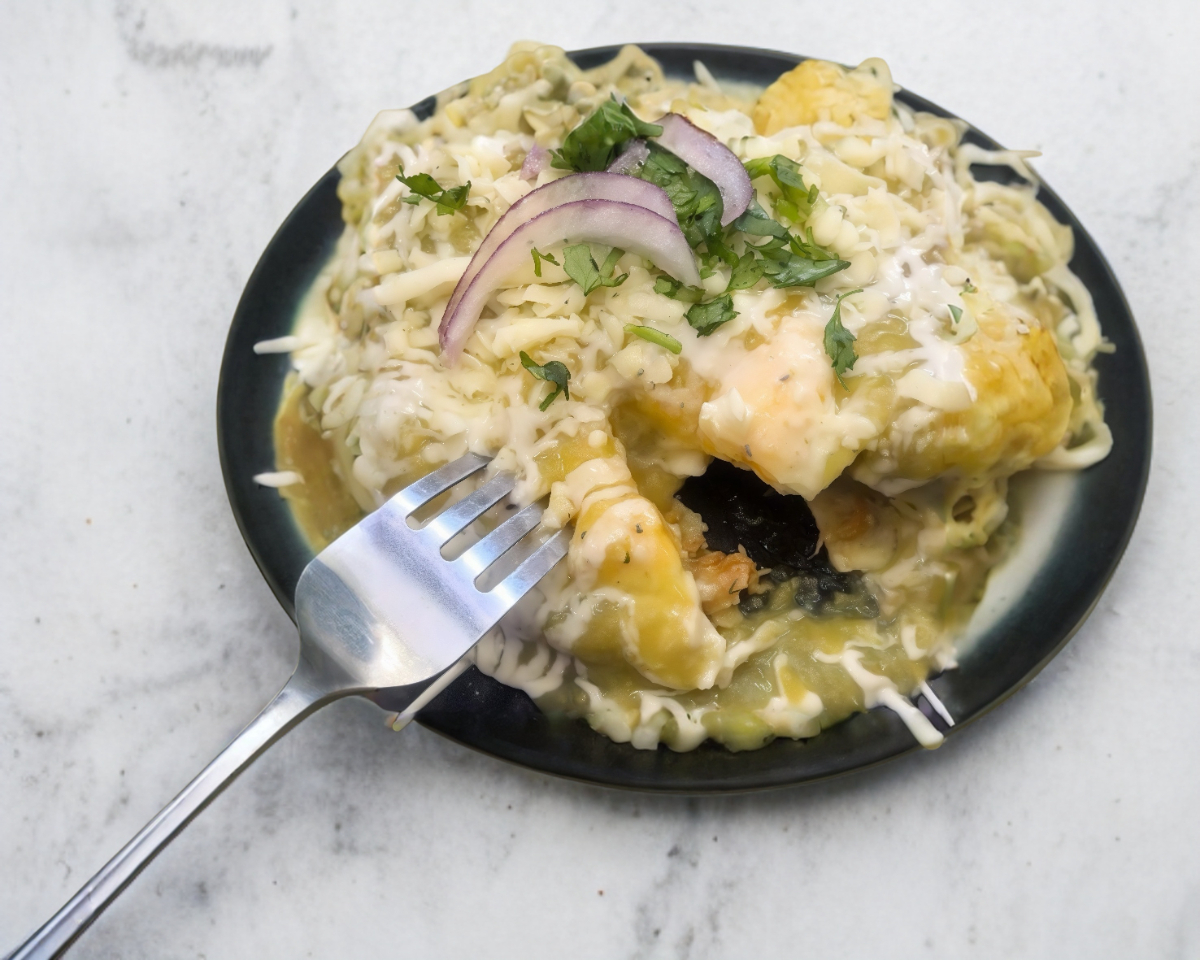 Tortilla, chicharron prensado verde, tortilla, huevo estrellado, salsa, verde, queso, crema, cebolla y cilantro todo empalmado 🤤