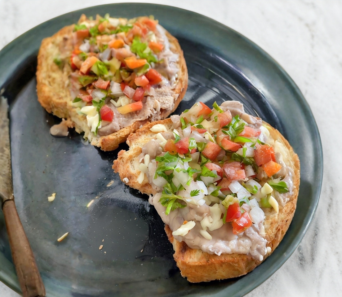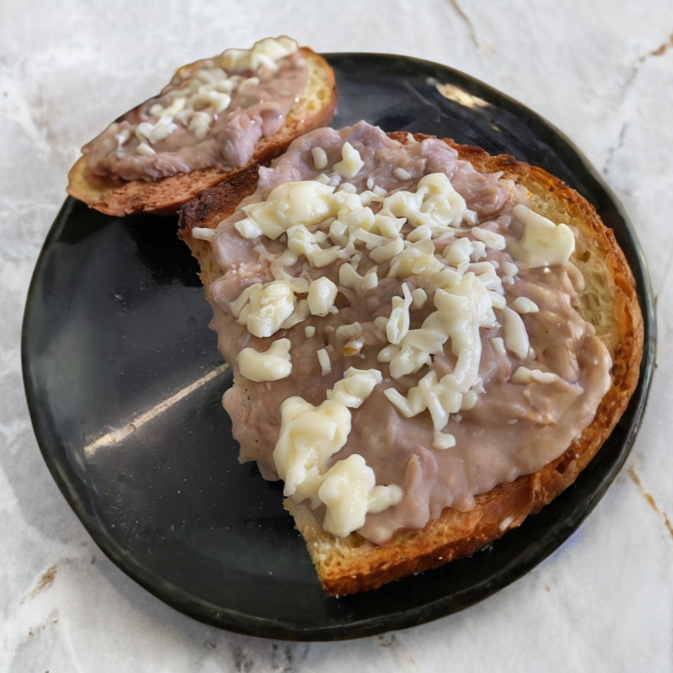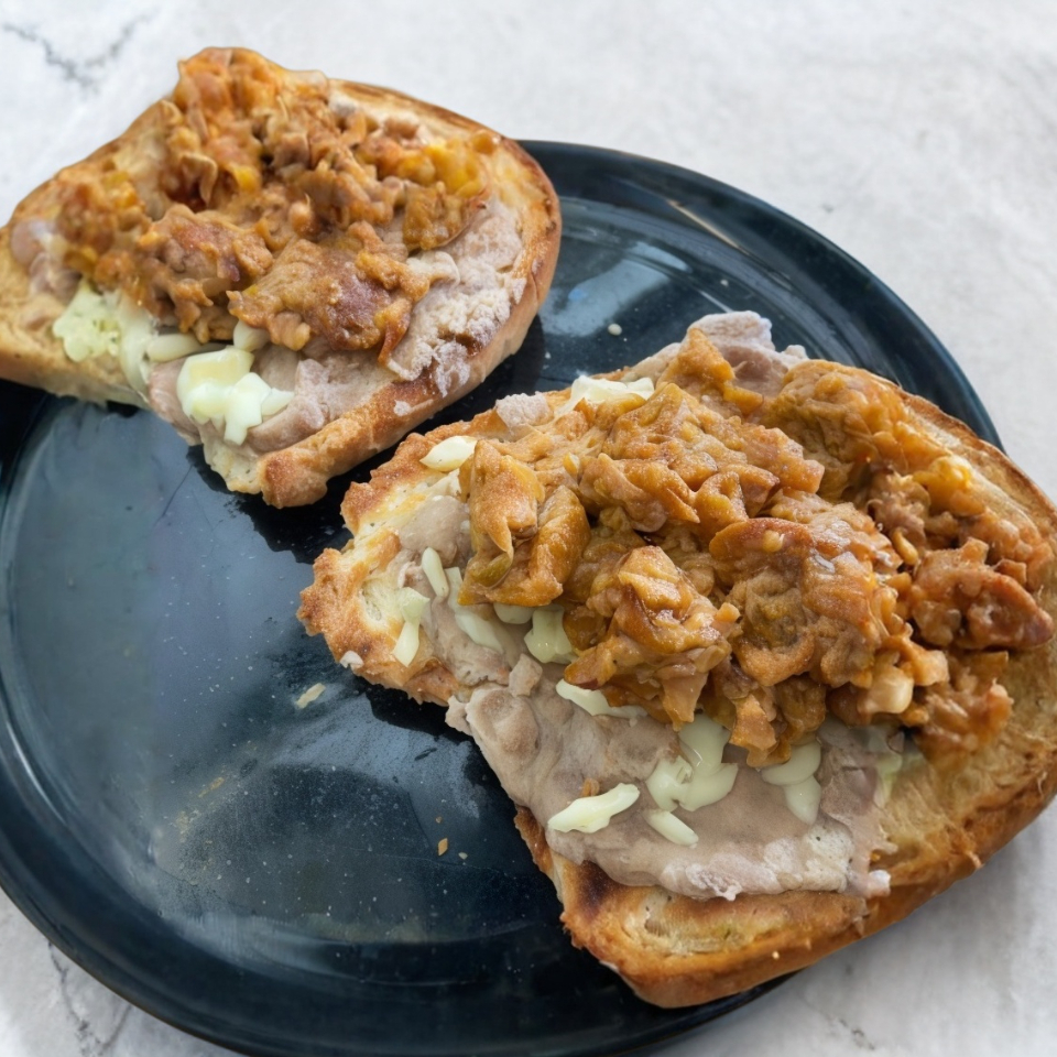 Molletes con base de frijoles y queso gratinado